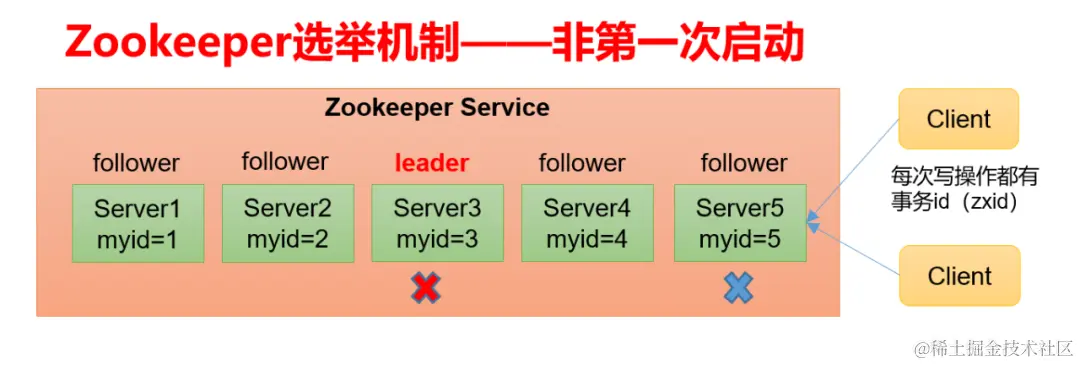 假设ZooKeeper由5台服务器组成,SID分别为1、2、3、4、5,ZXID分别为8、8、8、7、7,并且此时SID为3的服务器是Leader。某一时刻,3和5服务器出现故障,因此开始进行Leader选举。
