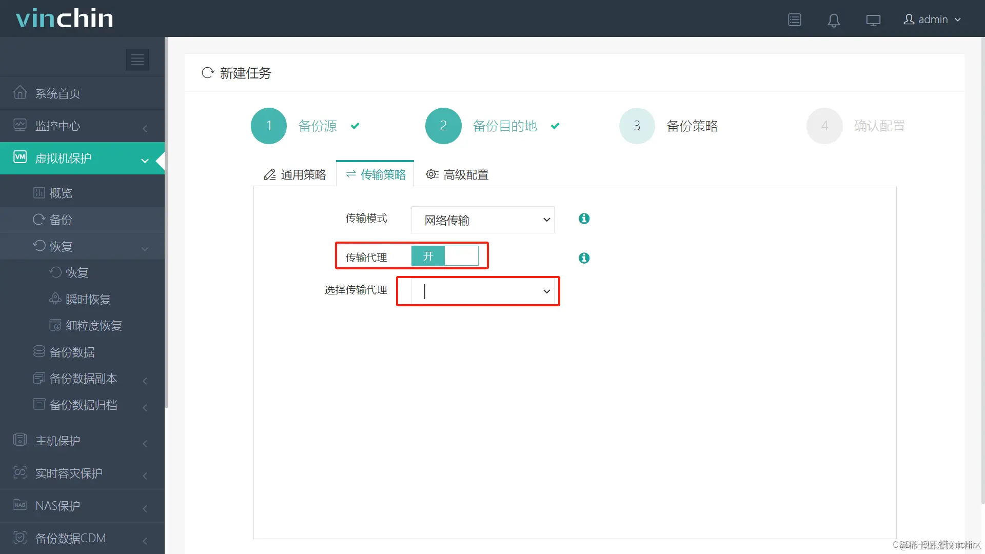 而在灾备建设中,也同样存在数据量大,带宽有限,传输不稳定等问题,因此灾备中也有着传输代理。它是部署在虚拟化平台或者数据中心的物理服务器上的,用于提高任务效率,节省网络带宽。通过传输代理镜像部署代理虚拟机,开启后选择对应的代理虚拟机,进行恢复数据传输。在系统中,虚拟机保护功能中,备份数据时可以选择传输策略,策略中根据实际灾备环境情况,选择传输方式,比如网络传输,LAN-Free传输或是传输代理。