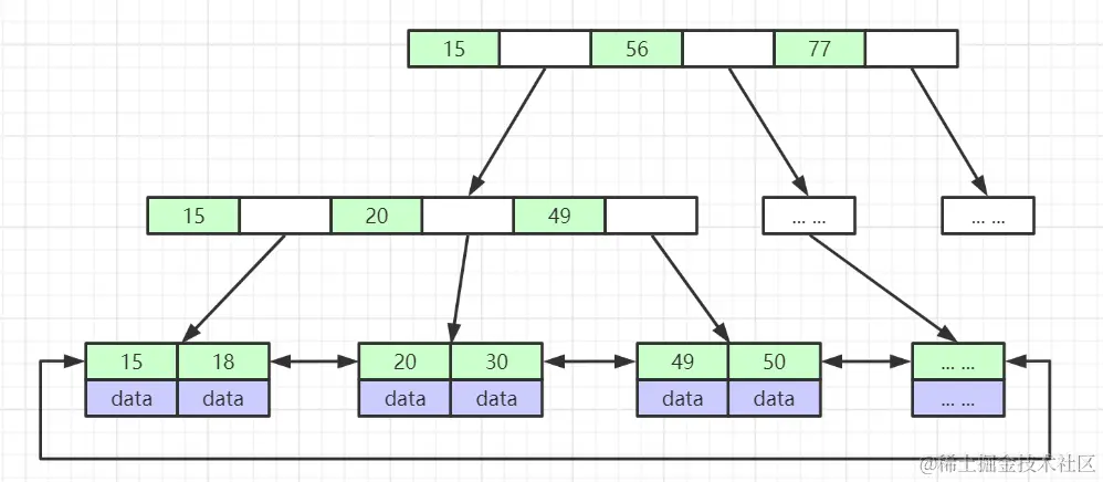 3、每个叶子节点都存有相邻叶子节点的指针,提高区间访问的性能