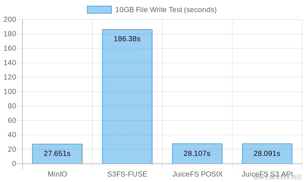 从测试数据可以清楚地看到,写入同样的 10GB 大文件,S3FS 需要 3 分钟,而 MinIO 和 JuiceFS 只需要 30 秒左右,速度相差近 6 倍,这主要是由于不同的技术实现导致的。