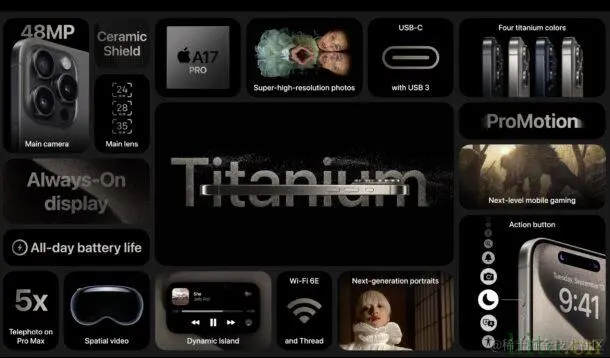 IPhone 15 Pro和iPhone 15 Pro Max采用了新的A17 Pro芯片,钛框架设计,静音开关已经被一个可定制的动作按钮取代,以及典型的年度增量更新;有wi-fi,蜂窝网络,略微改进的摄像头(iPhone 15 Pro Max除外,它有一个很好的提升到5倍光学变焦镜头),等等,所有你在一年一度的iPhone发布会上期待的东西。