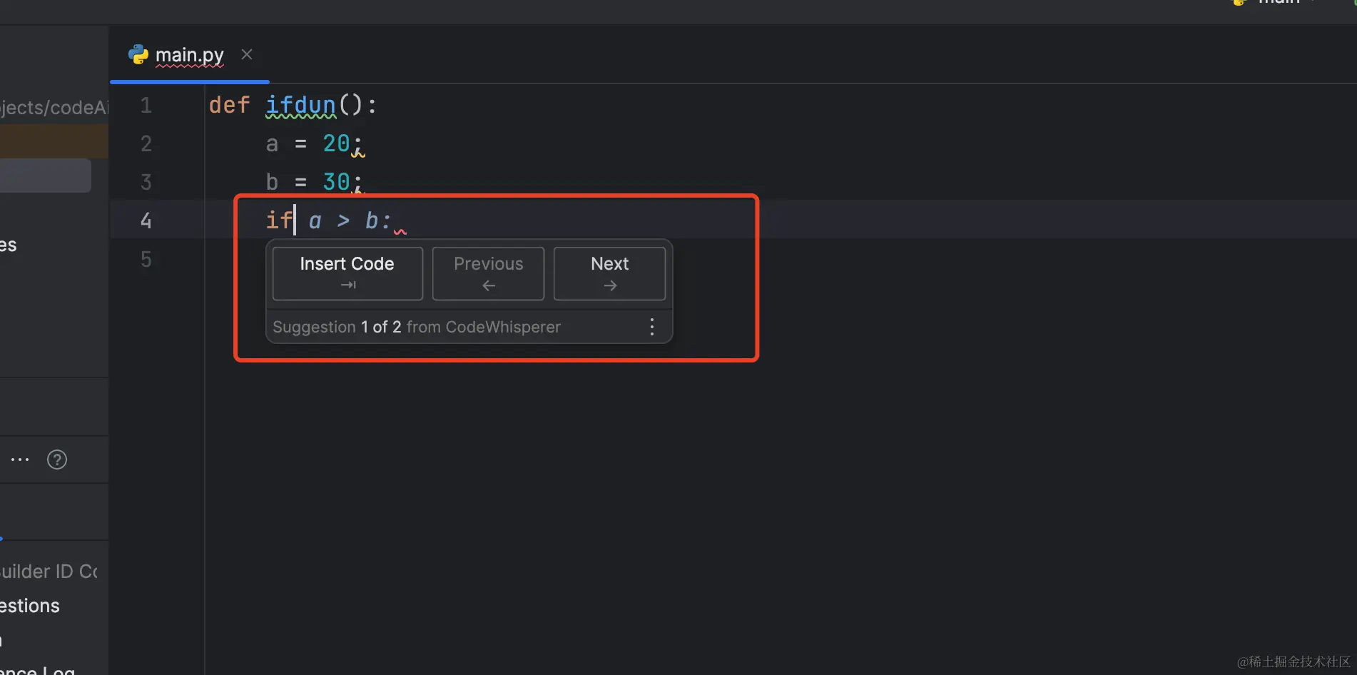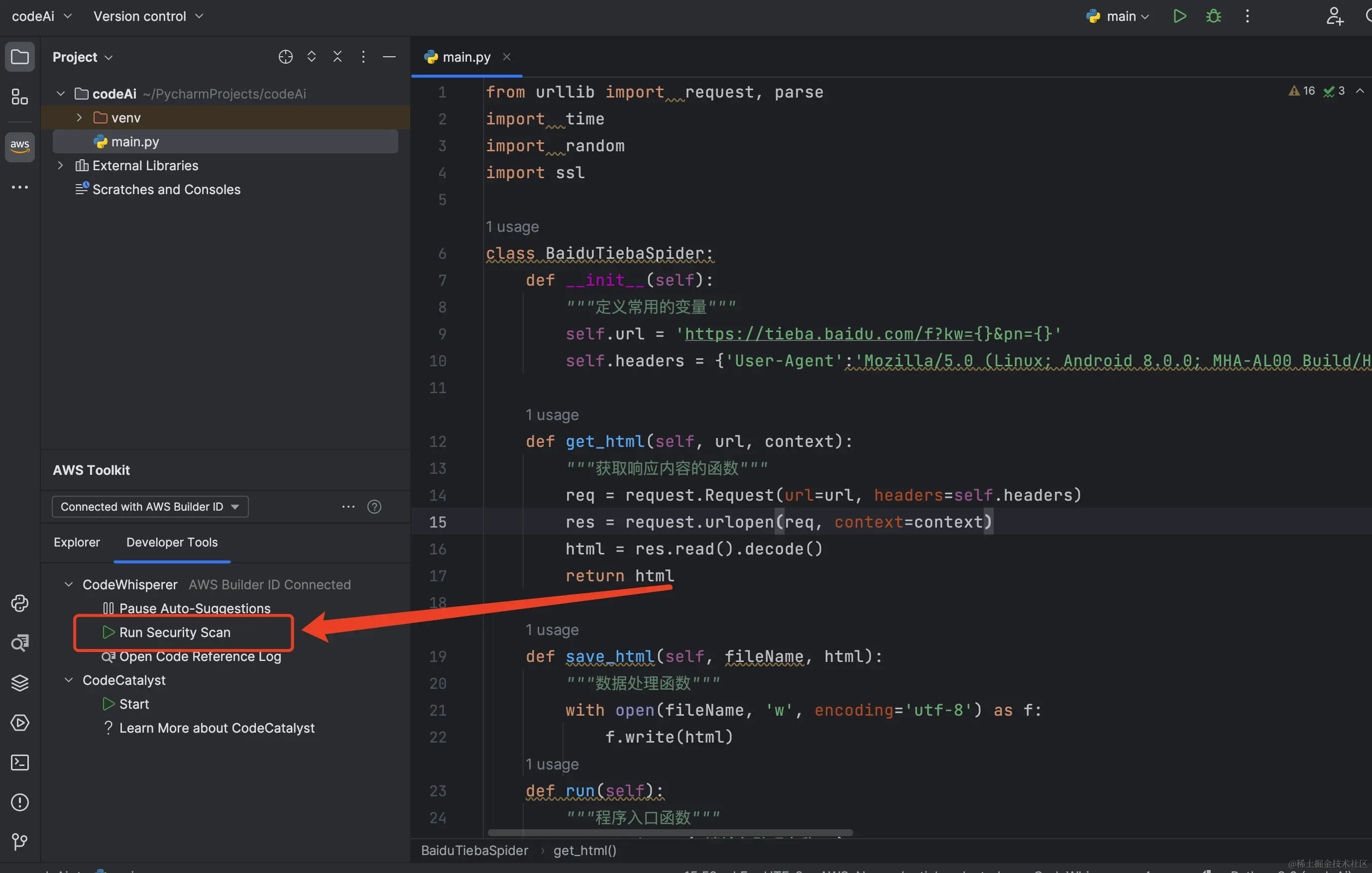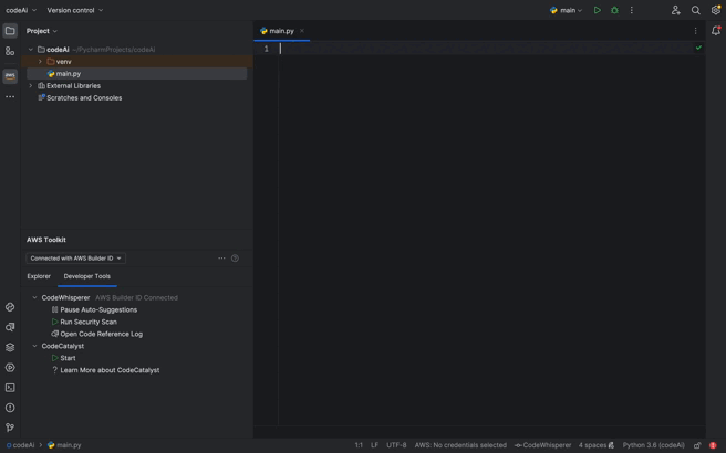 回到我们的pycharm编辑器, 看下CodeWhisperer如和帮助我们自动生成代码