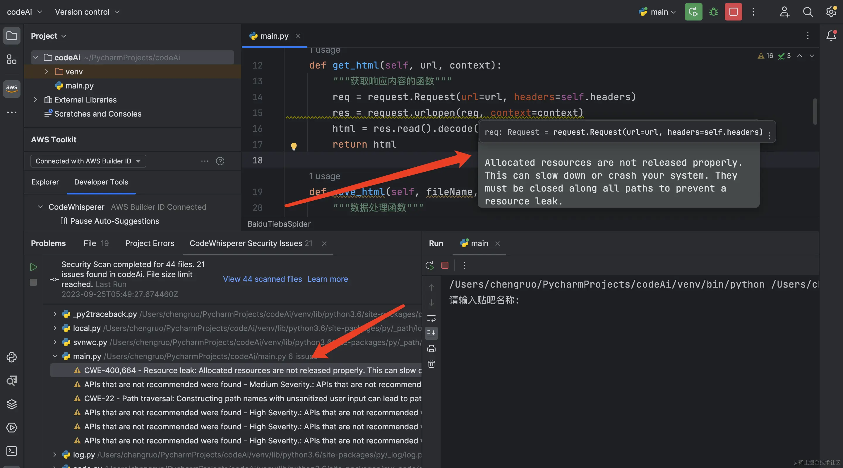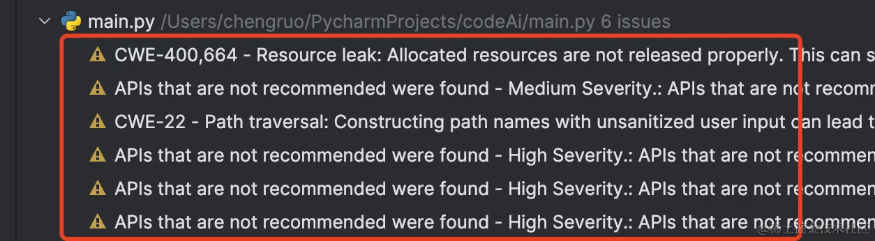 我们在pycharm中建立一个爬虫文件,对这个文件进行安全扫描, 查看结果