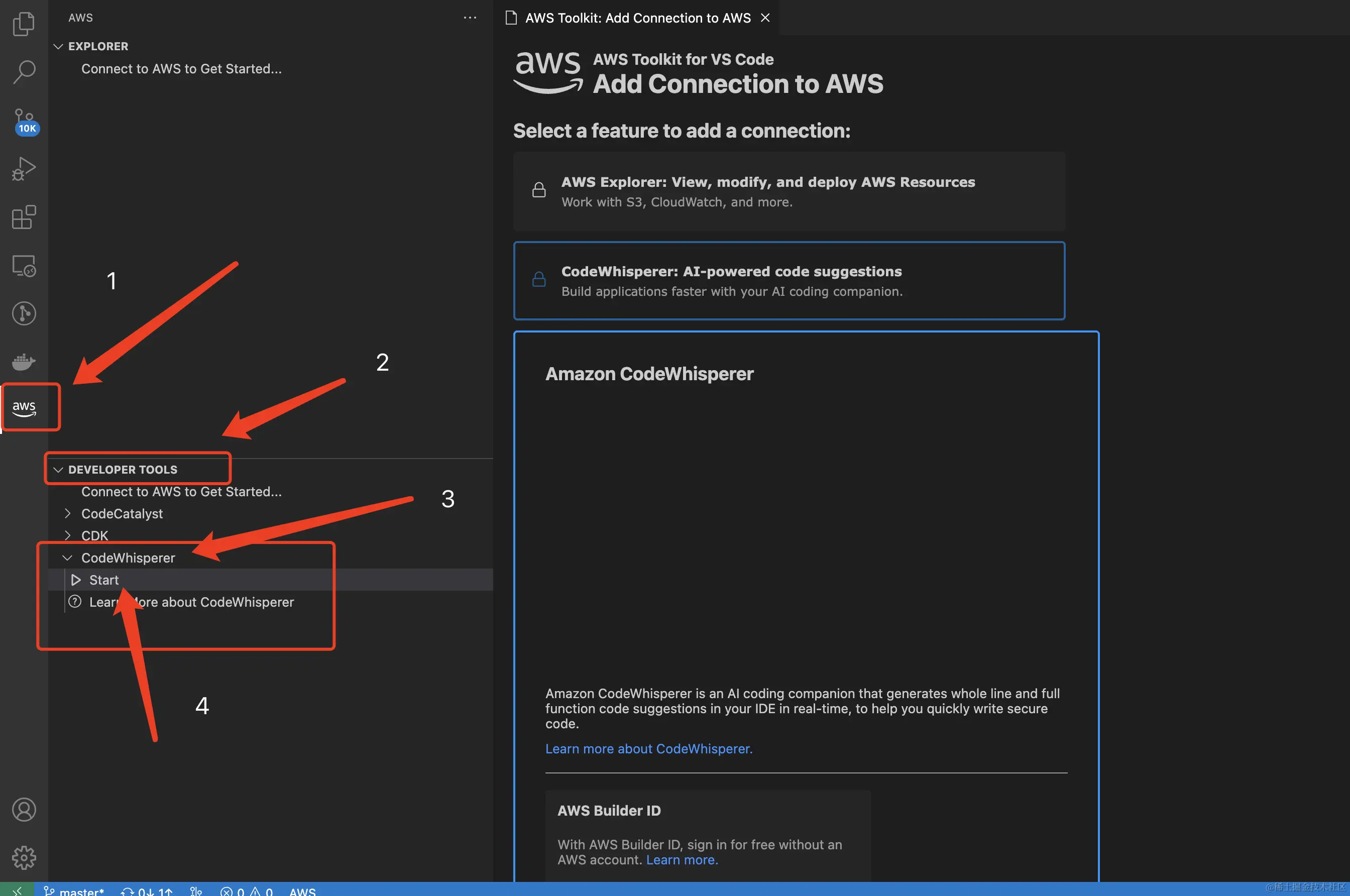 点击 Developer Tools tab 页面,选择CodeWhisperer/Start , 如下 图二所示.
