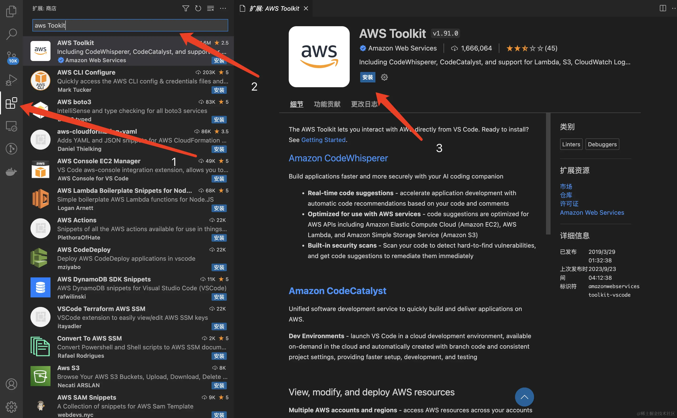 AWS Toolkit插件, 具体到VS Code侧边栏搜索并安装