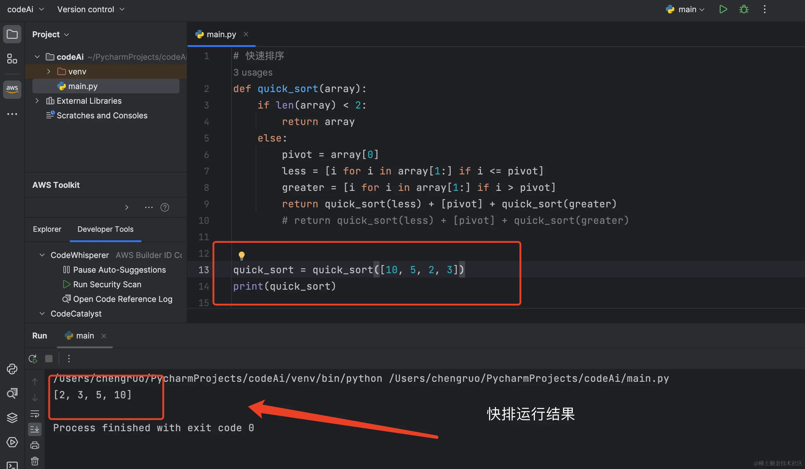 如上述代码所示,我们一步一步的跟着思路来使用CodeWhisperer 来生成我们所需要的代码 , 此时我们运行代码效果如下: