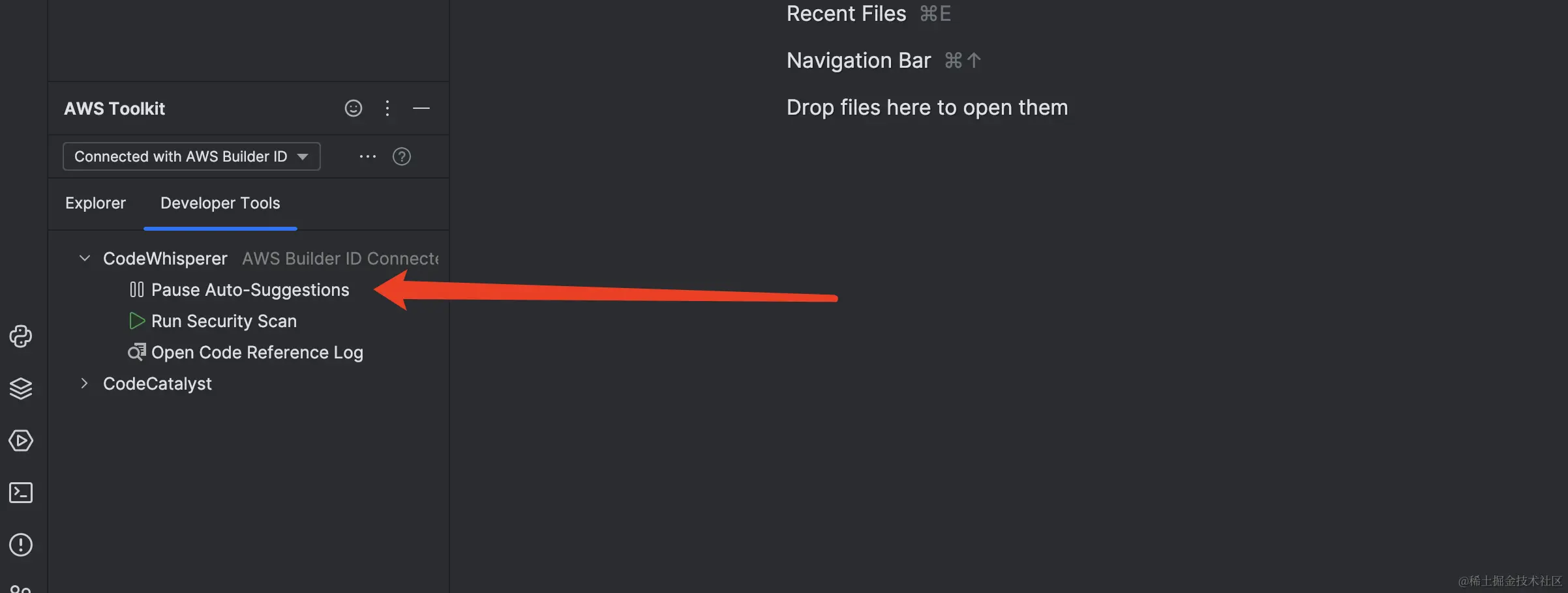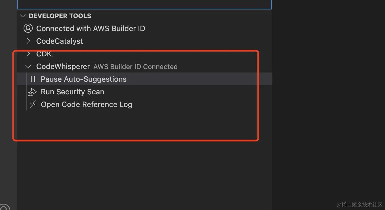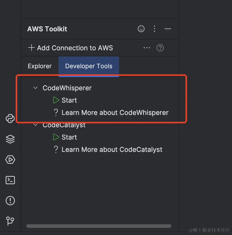 返回IDEA, 在AWS Toolkit视图中的 Developer Tools中可以打开或者关闭代码生成功能, 如下图所示: