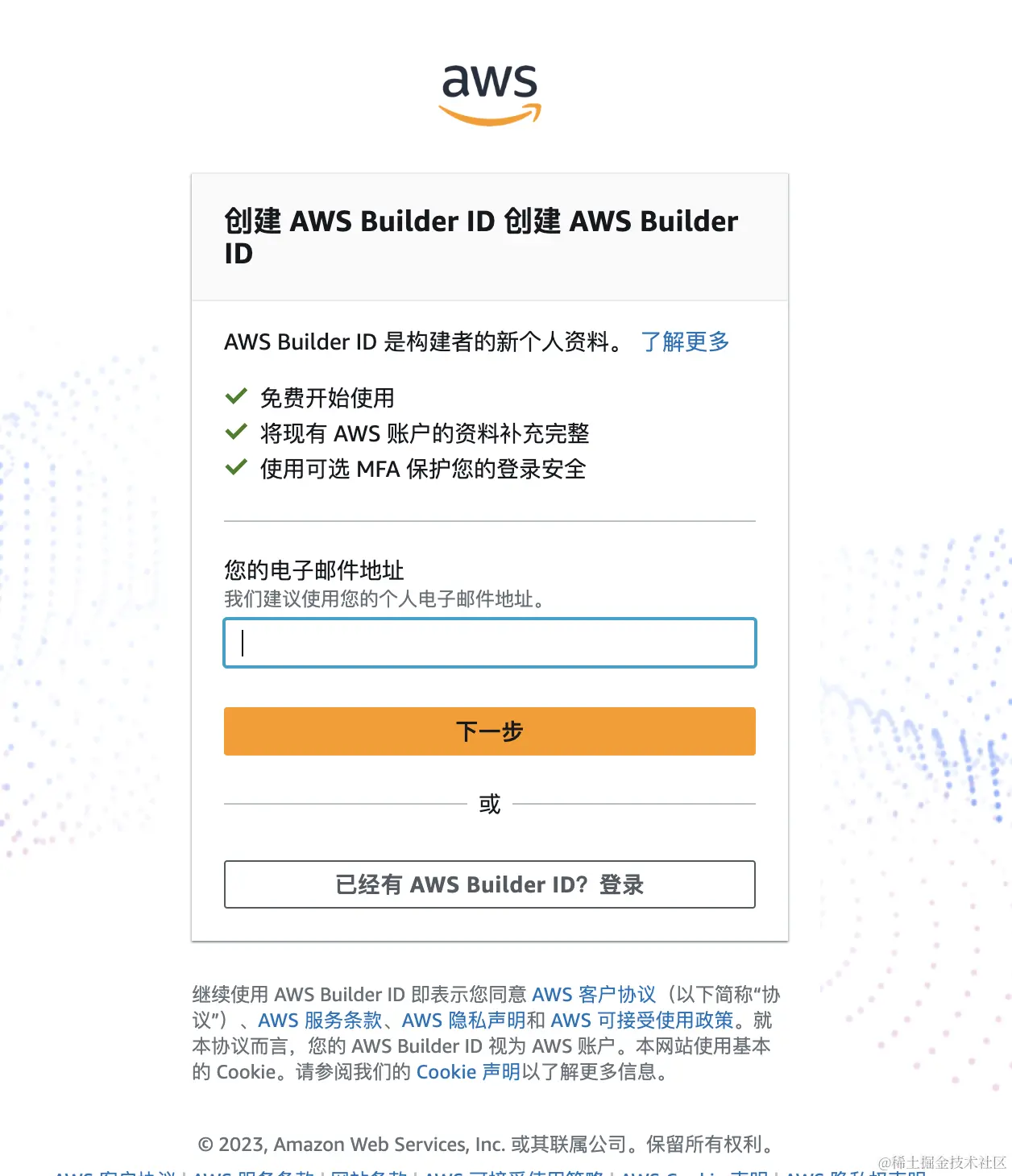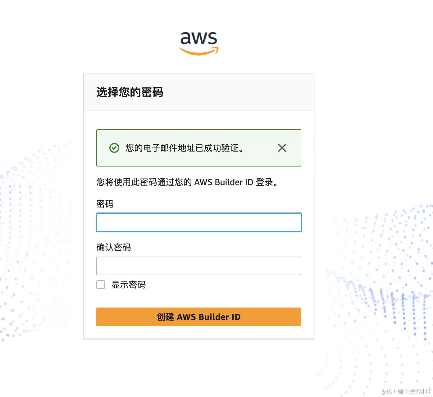 输入完验证码之后, 会让你填一下密码, 这个密码就是你 Amazon的密码, 设置完密码后, 点击 创建 AWS Builder ID