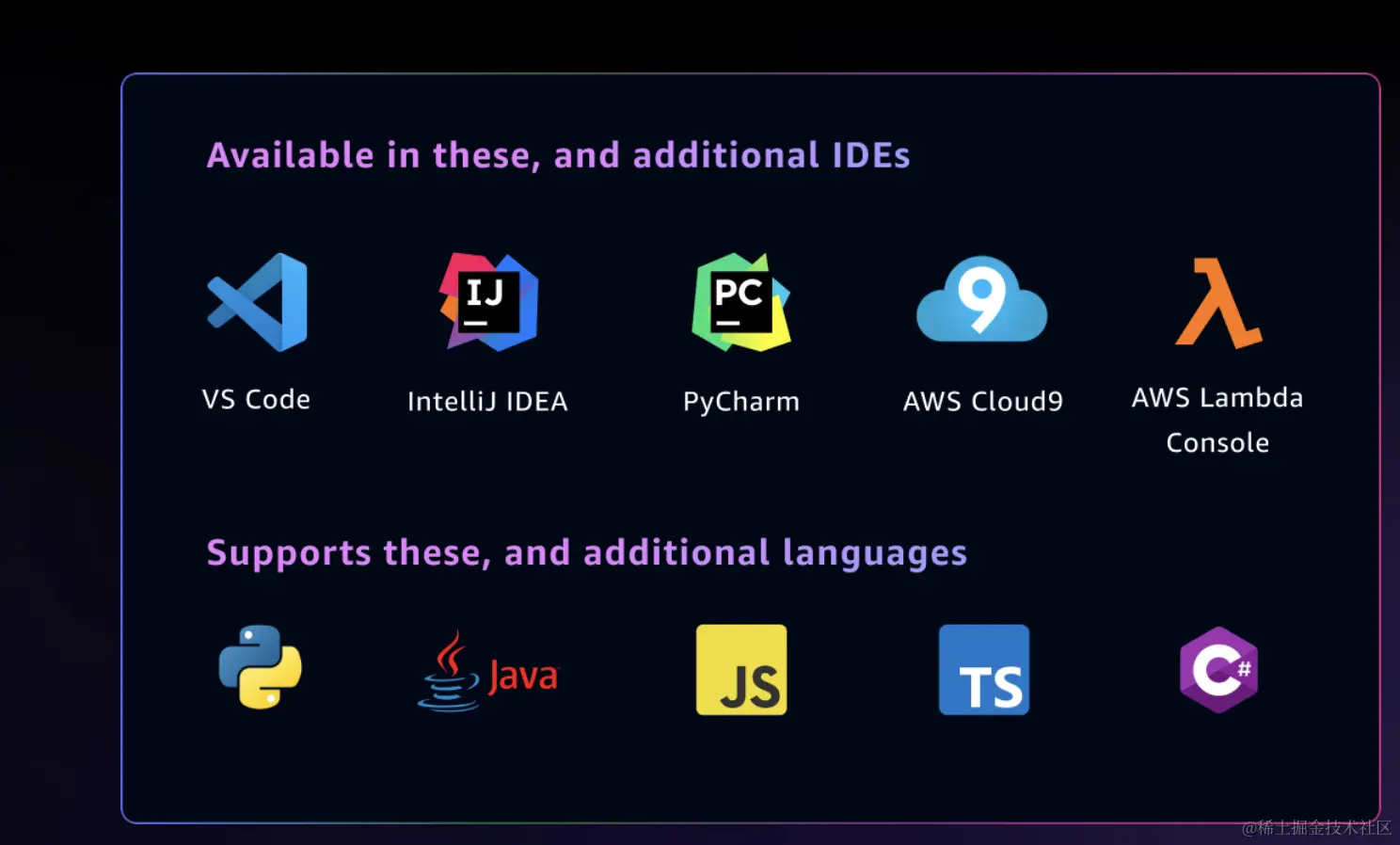 目前,CodeWhisperer可以免费使用,没有任何限制。它支持15种编程语言,包括Python、Java和JavaScript,同时也可以与多个集成式开发环境(IDE)进行集成,例如VS Code、IntelliJ IDEA、AWS Cloud9、AWS Lambda 控制台、JupyterLab和Amazon SageMaker Studio。