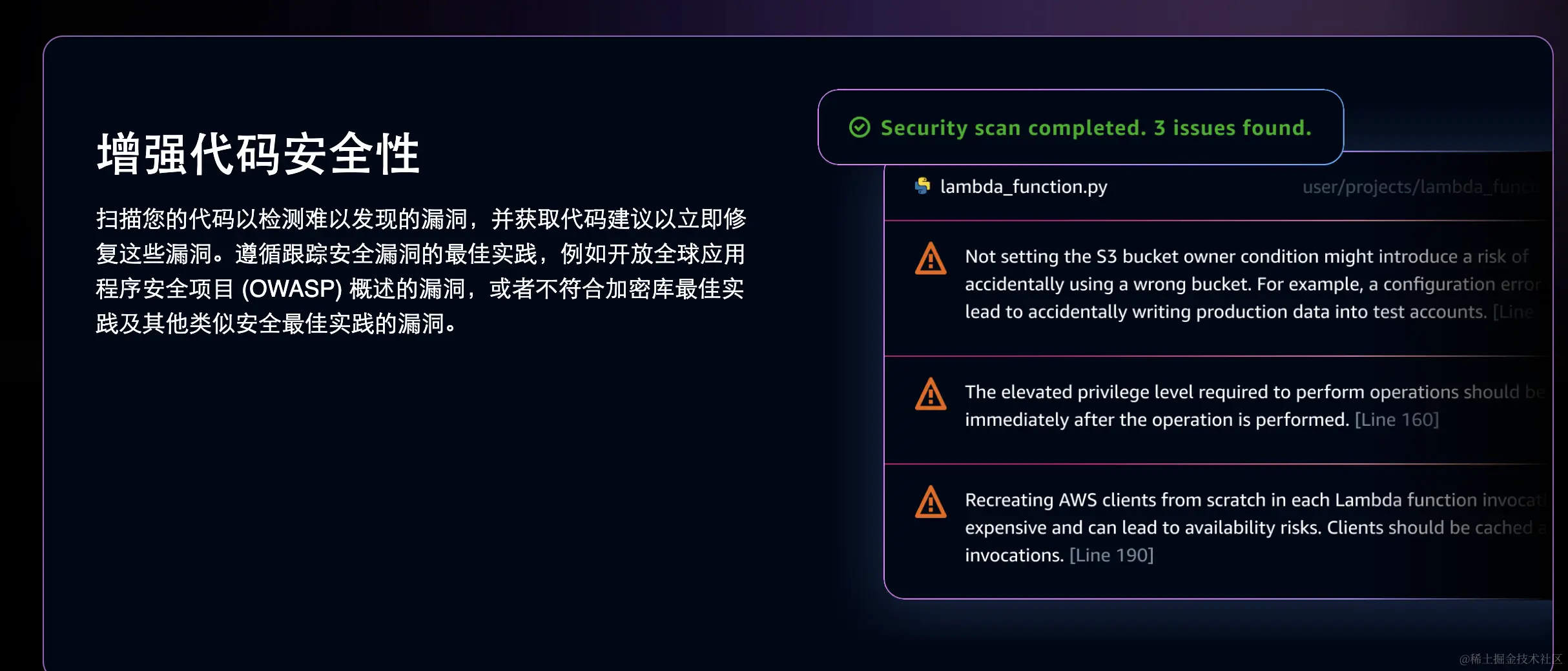 为了增强代码的安全性,CodeWhisperer提供了代码扫描功能,可以检测难以发现的漏洞,并提供相应的代码建议以立即修复这些漏洞。它遵循跟踪安全漏洞的最佳实践,比如开放全球应用程序安全项目(OWASP)描述的漏洞,以及与加密库最佳实践和其他类似安全最佳实践不符的漏洞。