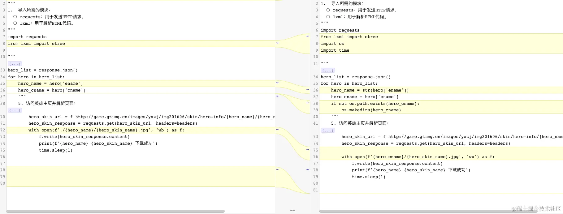 requests.get()方法向指定URL发送请求,获取英雄列表的JSON数据。 - 使用