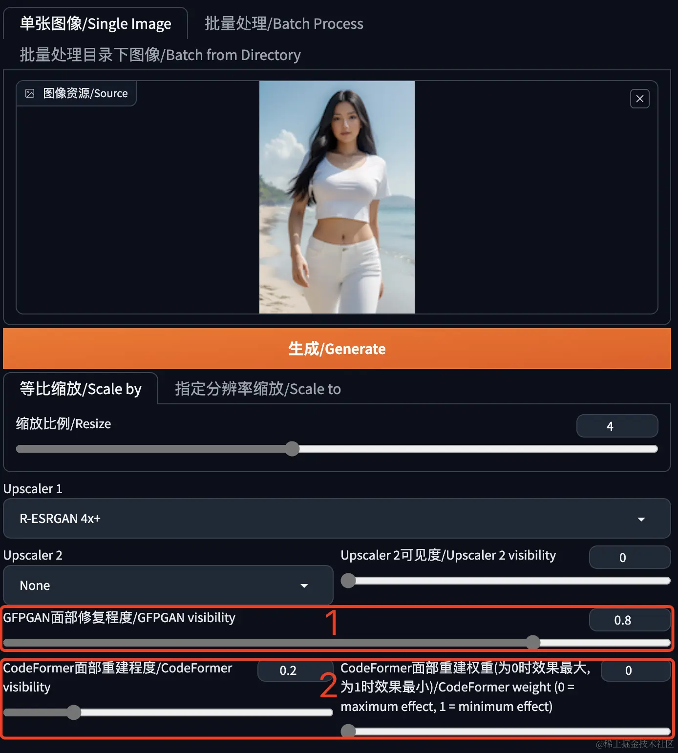 这两个模型可以一起使用,我们可以通过 GFPGAN visibility 和 CodeFormer visibility 来设置它们的参与度。