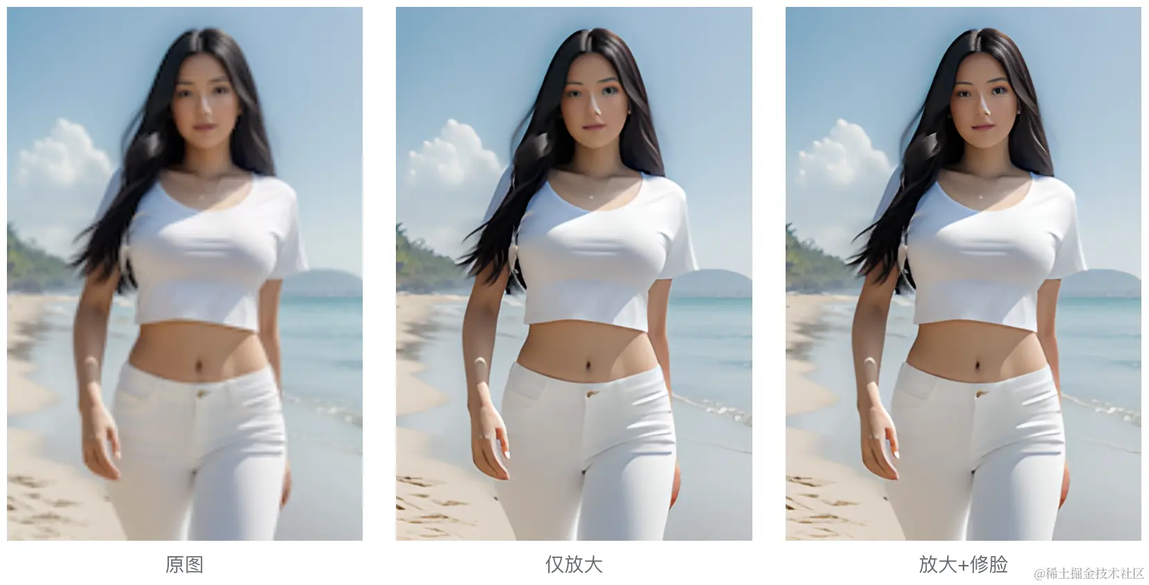1、原图是 Stable Diffusion 生成的,我用图片管理工具缩小了分辨率。可以看到,相比仅放大,加上修脸之后,人物的面部有了明显的改善。