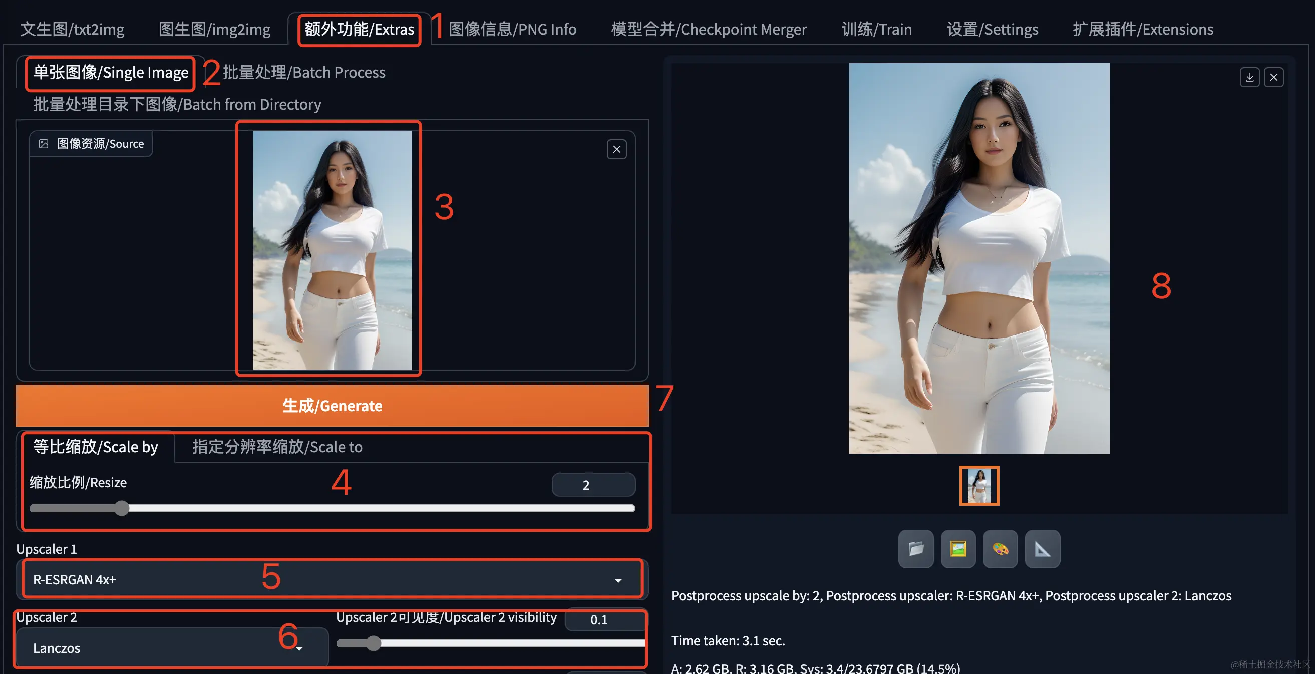 6、Upscaler2 用来避免 Upscaler1 过度处理的问题,比如磨皮太严重。可以使用一些普通方法算法,比如 Lanczos。Upscaler2 可见度是指图片放大时使用 Upscaler2 算法进行处理的比例,为0时完全不使用 Upscaler2,为1时只使用 Upscaler2。