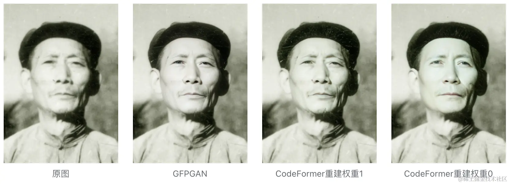 2、这是一张从网上收集的图片,原图就是比较模糊的老照片,分别单独使用GPFGAN和CodeFormer的效果。GFPGAN的人物气质拿捏的比较到位,CodeFormer面部纹理更真实一些,但是不宜将重建权重值设置的过小。