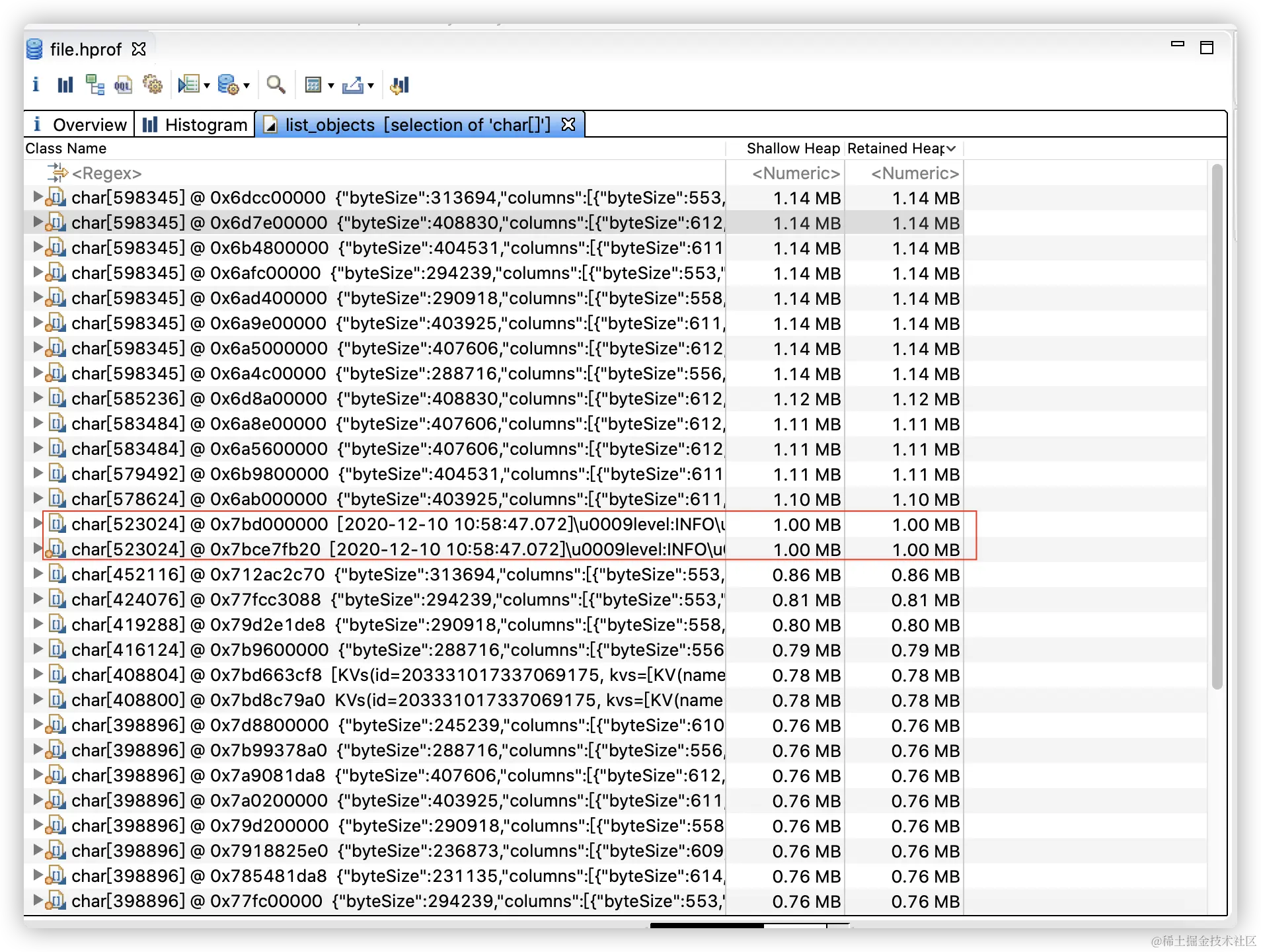 红框内,对象属于日志,可以优化或降低日志等级,来解决对象过大, 。