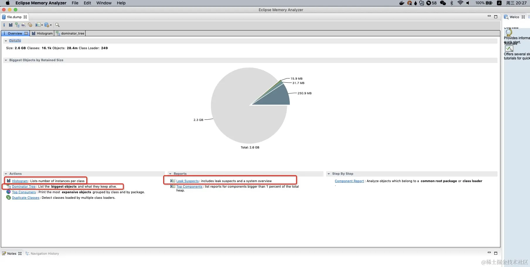 - 菜单栏 "File" -> "Open Heap Dump",打开dump文件,打开后如下图: