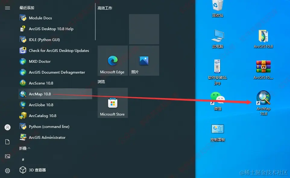 15.开始菜单栏找到ArcMap10.8图标将其拖到桌面。