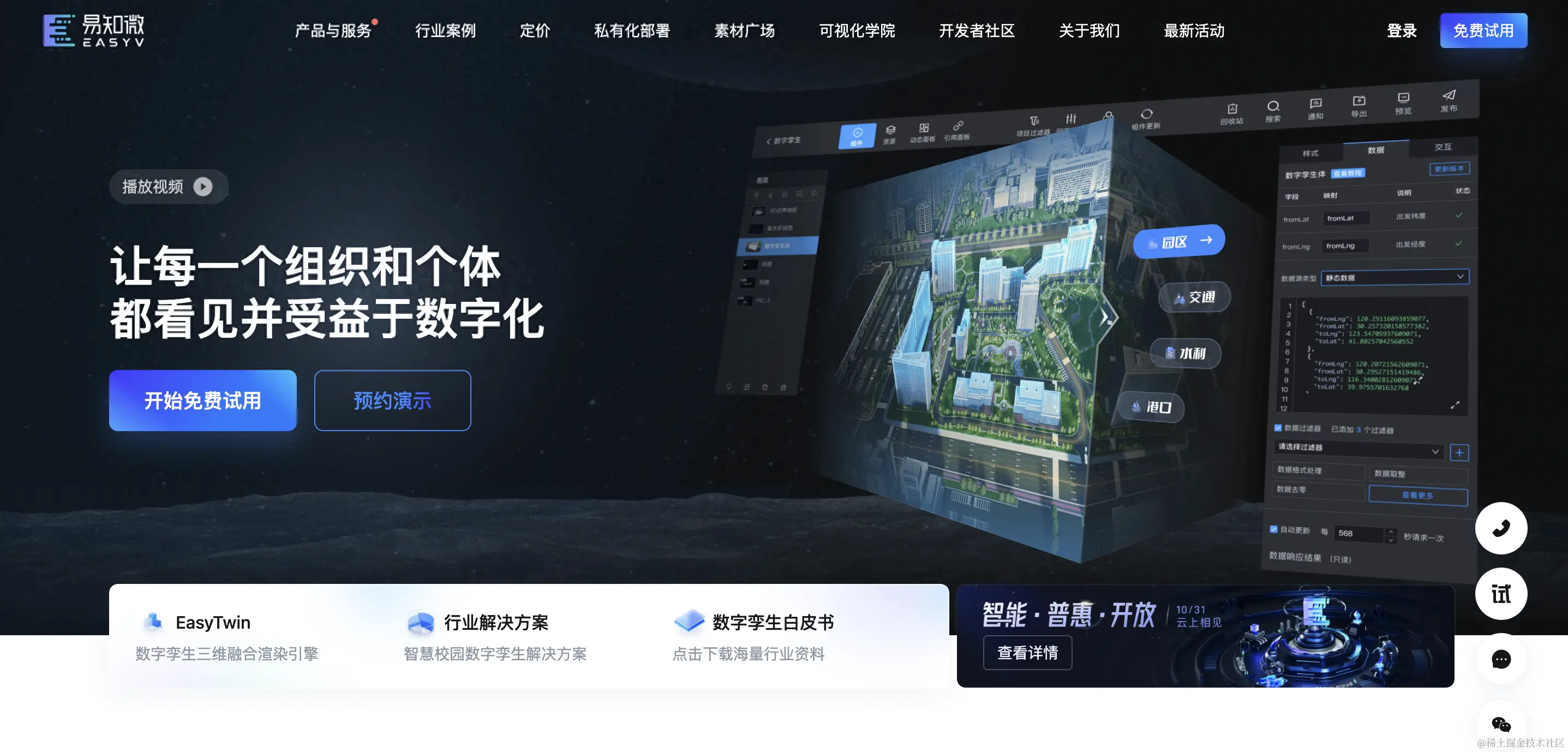 易知微-EasyV数字孪生|智慧城市园区工厂水利双碳|三维地图数据可视化大屏