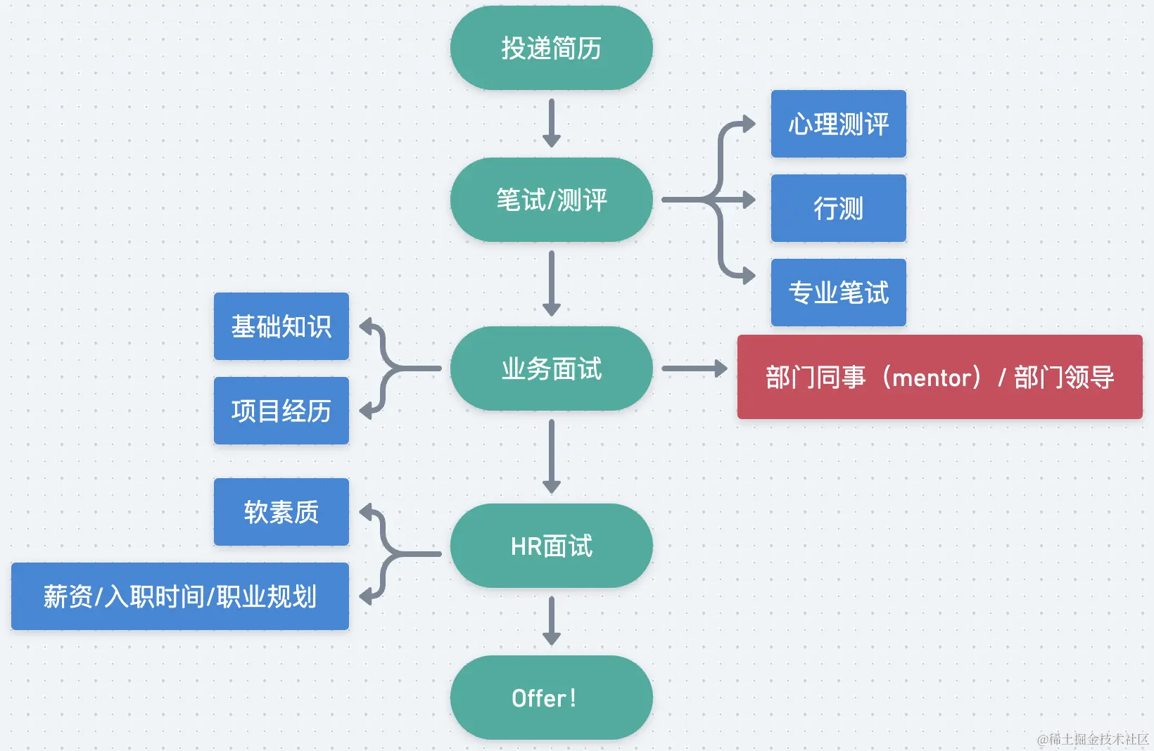 如果前面的环节都通过了,就进入到了面试阶段。大部分公司都会有一轮以上的面试,包括业务面试和HR面试,一些互联网公司会有多轮业务面试。业务面试官一般是部门的同事和领导,问的问题主要是与岗位相关的基础知识和你在简历上写的项目经历。HR面试的主要内容是软素质的考察,以及就职时间、地点、薪资等细节的沟通。一般来说能够进入HR面就意味着有很大的概率成功。