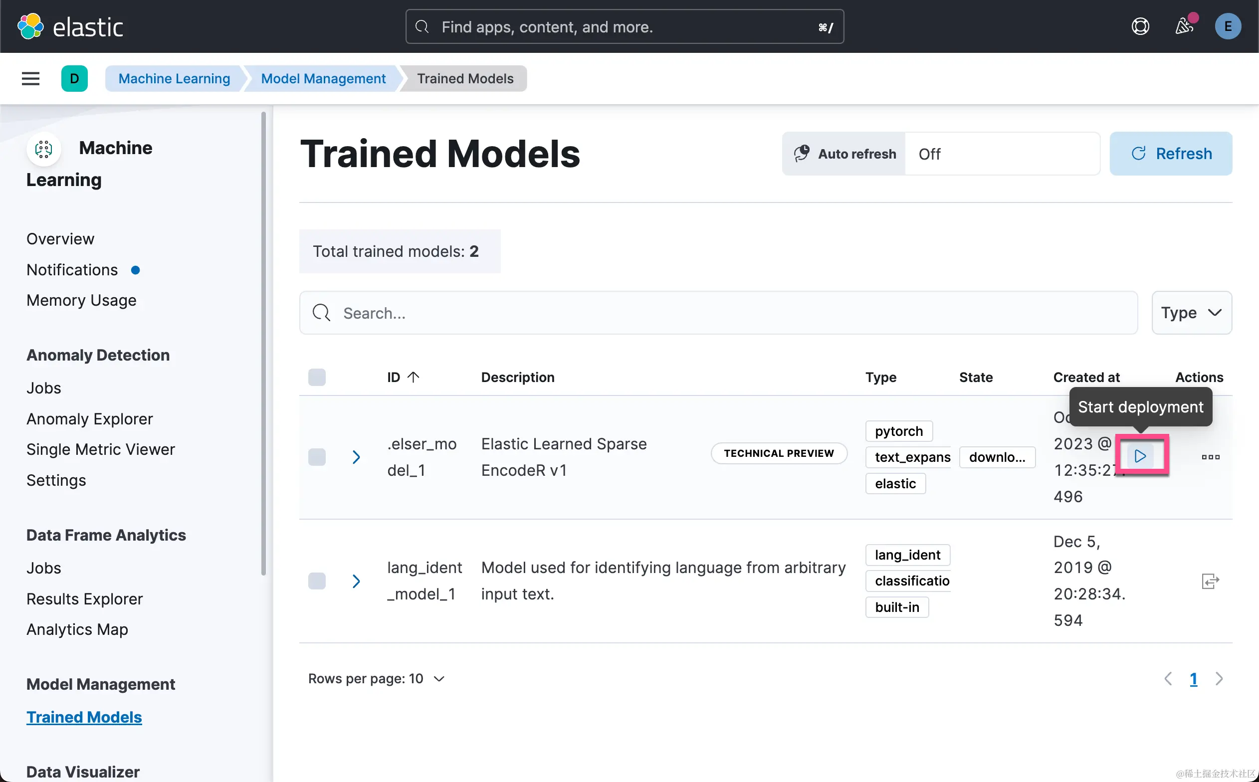 在这个步骤中,我们需要启动 ELSER。有关 ELSER 的启动,请参阅文章 “Elasticsearch:部署 ELSER - Elastic Learned Sparse EncoderR”。