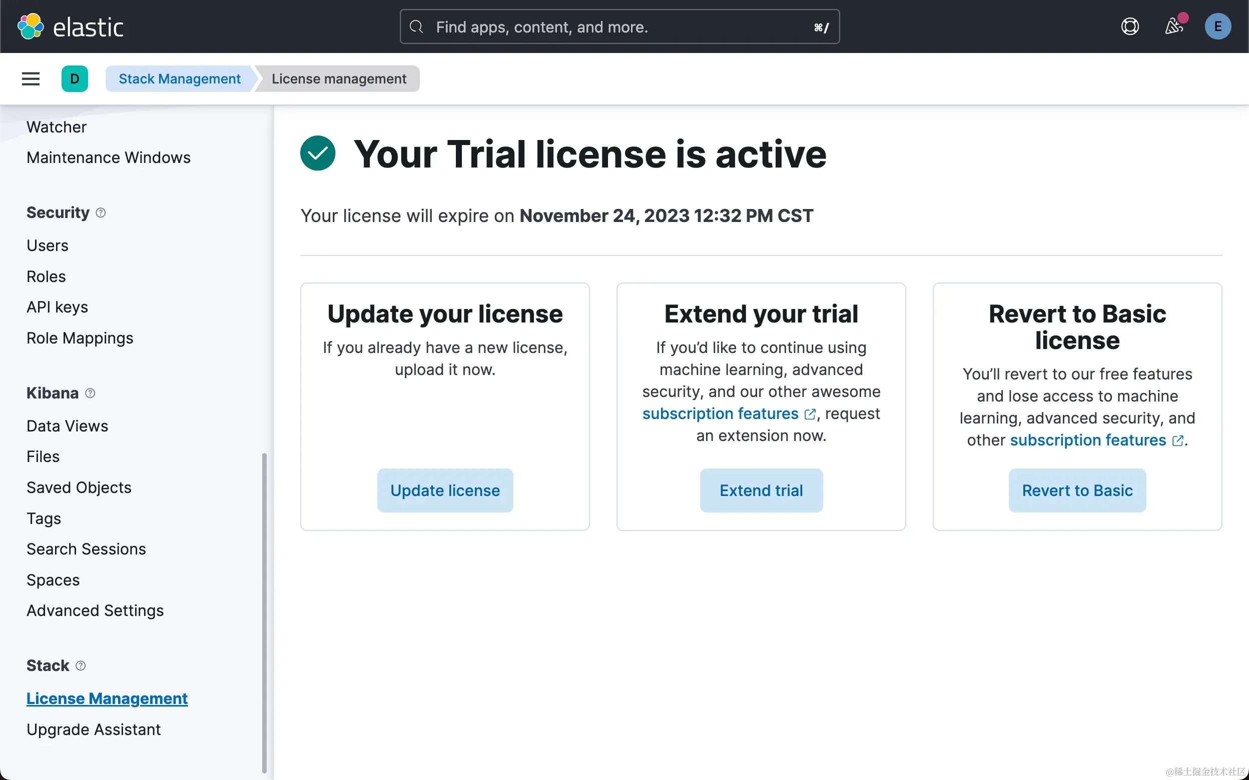造成这个错误的原因是因为当前的 License 模式不支持 RRF。我们去 Kibana 启动当前的授权: