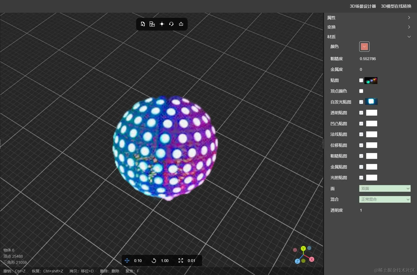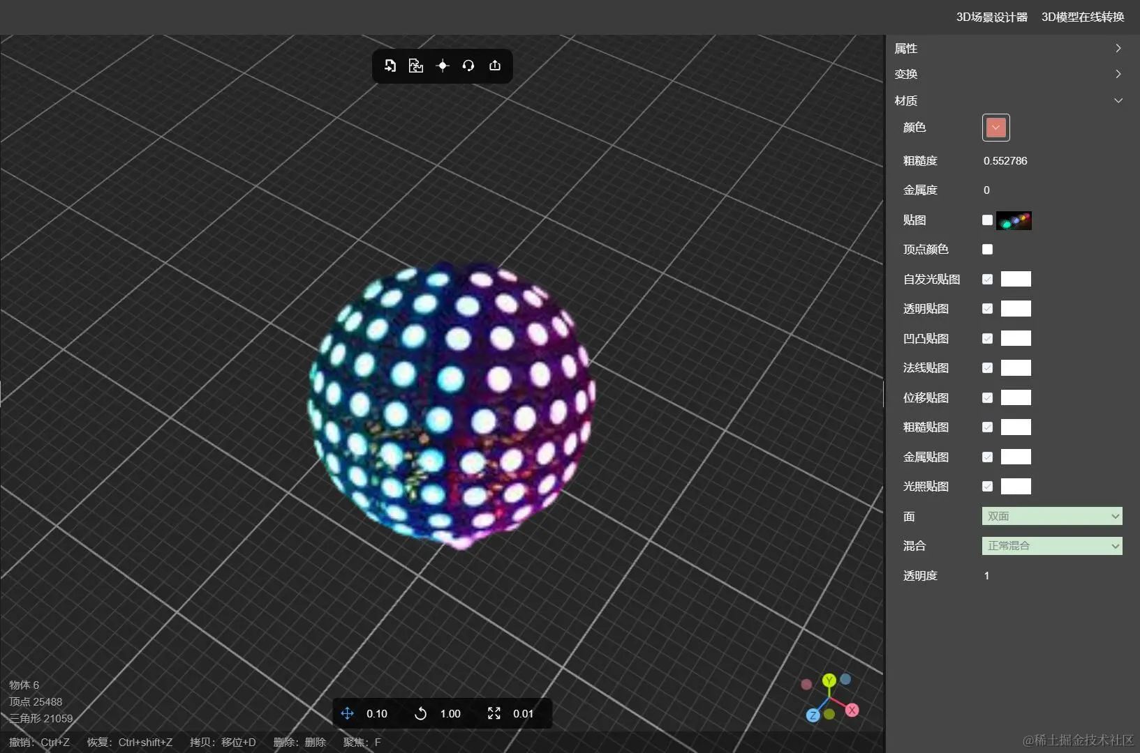 以上是一个LED球灯模型,需要设置模型的自发光贴图来模仿彩灯的霓虹灯效果,使模型看起来更加真实。操作方法如下:在 GLTF 编辑器 中打开模型,选择模型,在右侧的材质面板中找到材质贴图,设置好贴图以后再设置自发光贴图就可以实现LED霓虹灯效果。