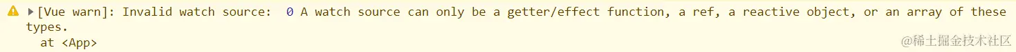 0 A watch source can only be a getter/effect function,a ref, a reactive object, or an array of these types. :一个侦听资源仅仅可以是一个 getter/effect 函数, 一个ref或者reactive独享,或者一个数组,属于这些类型