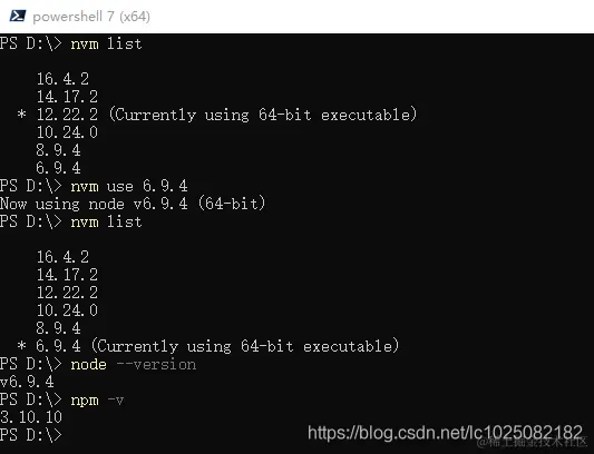 nvm use [version] [arch] :使用制定版本node。可指定32/64位。