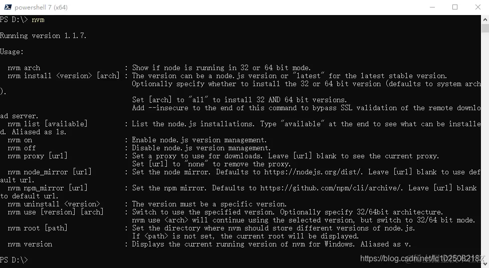 在命令行窗口输入nvm后有如下图信息证明安装成功: