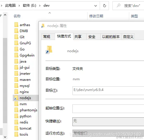 这时你会发现原先指定的E:/dev/nodejs目录变成了快捷方式,并且指向了E:/dev/nvm下安装的nodejs目录,如下图: