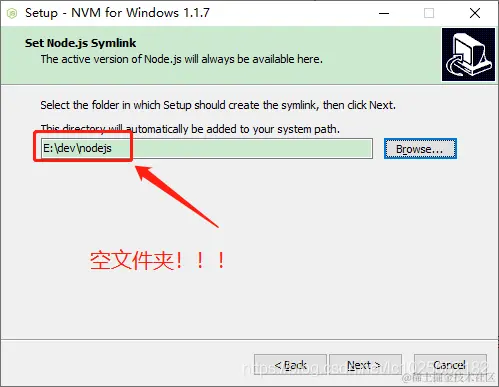 选择nodejs的快捷方式路径(这里一定得是空文件夹或者不创建这个文件夹,因为nvm会自动创建这个文件夹为快捷方式):