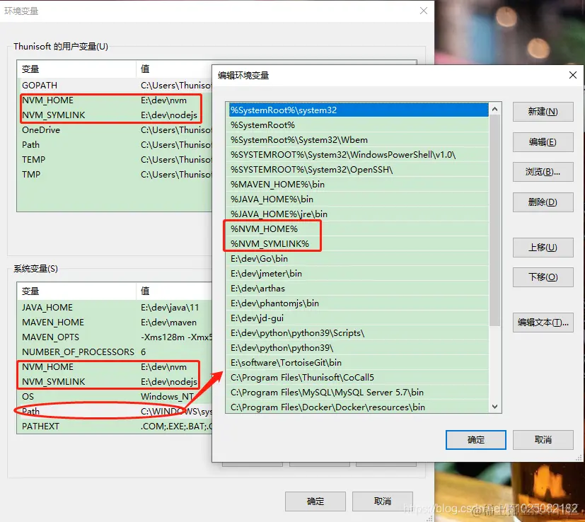验证: 安装完成后查看环境变量会发现新增了NVM_HOME(nvm安装路径)和NVM_SYMLINK(nvm自动创建的nodejs文件夹的快捷方式路径),如下图: