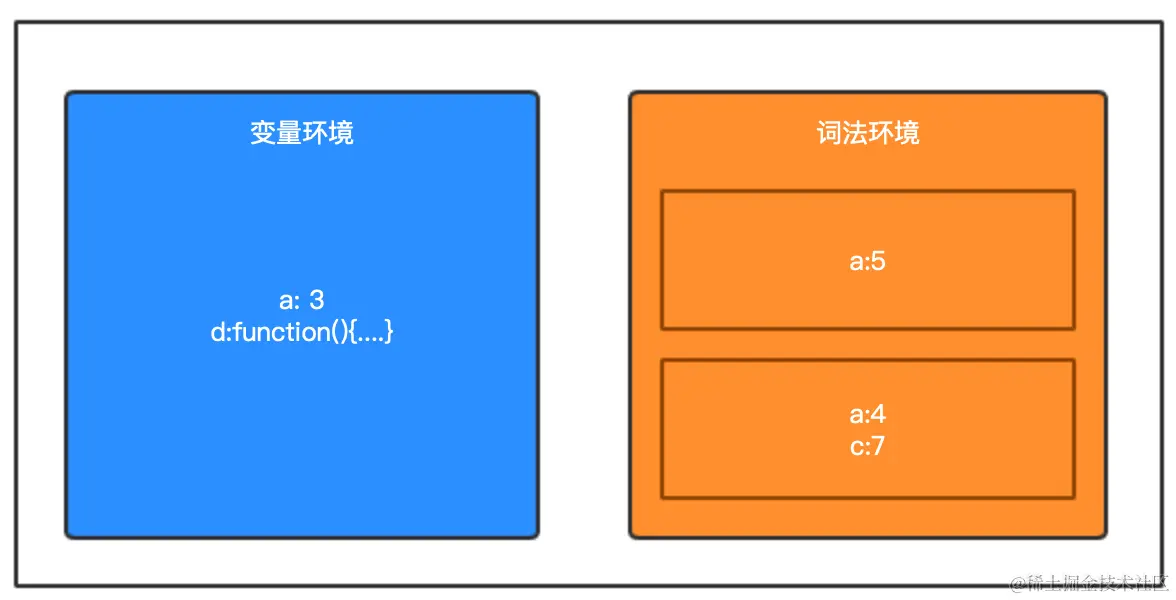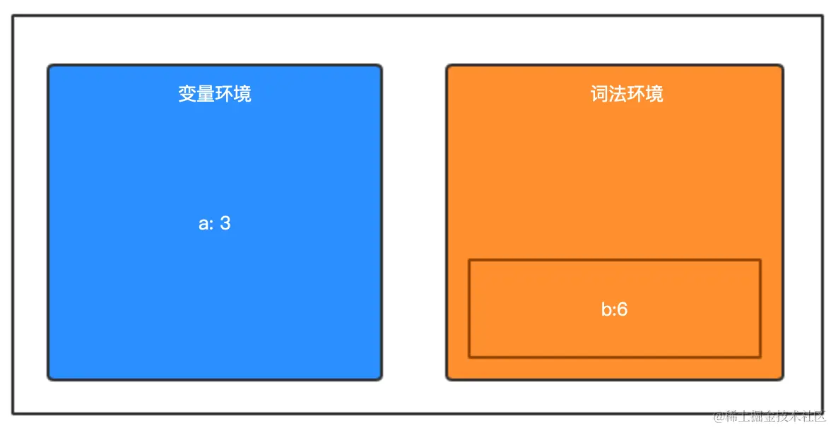 变量环境 前面说了,变量环境只是一个特殊的词法环境,特殊点就是词法环境是可变的,而变量环境是不变的。这个主要是针对块级作用域的方式实现。变量对象的实现是无法区分作用域的类型的,也不适合在执行上下文中填入多个变量对象来实现,所以需要一个新的实现。