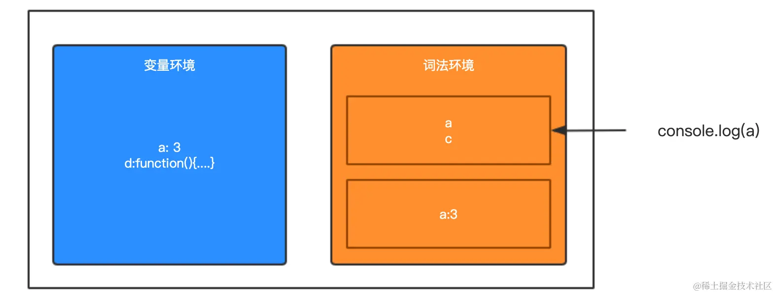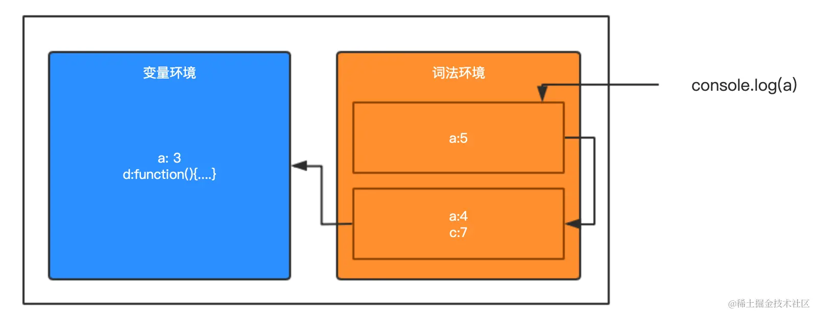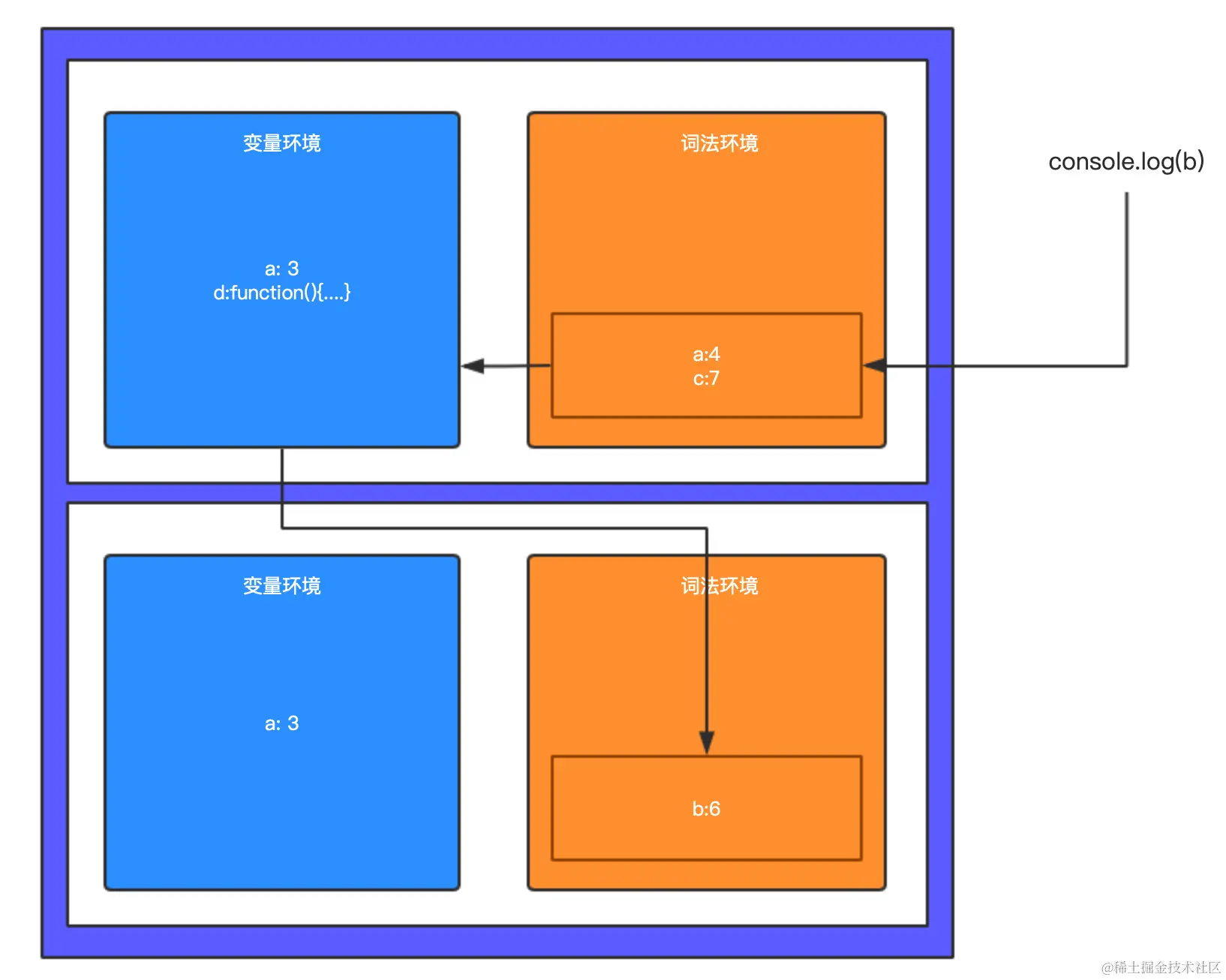 console.log(b),需要查找标识符b,查询的路径如下:可以看到查找是优先查找当前的词法环境,再到当前执行上下文的变量环境,没有则查找对应的外部环境,这里要注意外部环境不一定是执行栈的上一个,是当前词法环境的外部环境属性指向的词法环境。