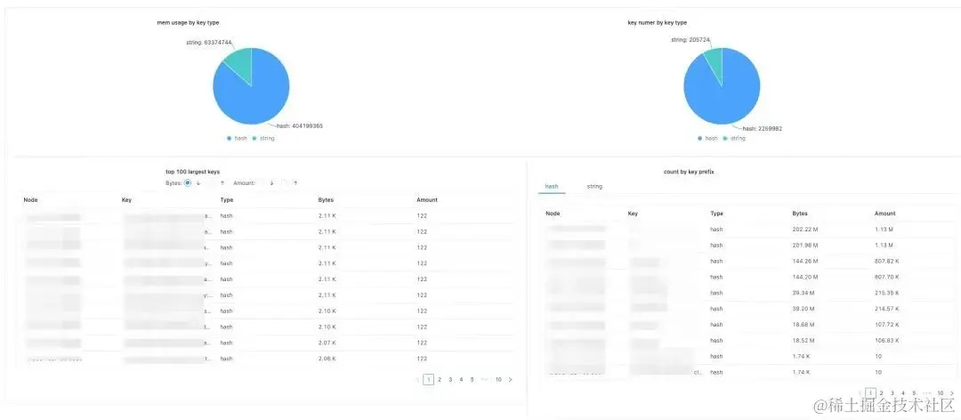 RDB 离线分析: 运维平台支持生成 RDB 文件,并自动进行数据离线分析。分析结果包含 Top100 Value 最大的 Key 和元素个数最多的 Key;每种类型 Key,不同 Key 前缀包含的 Key 数量等。
