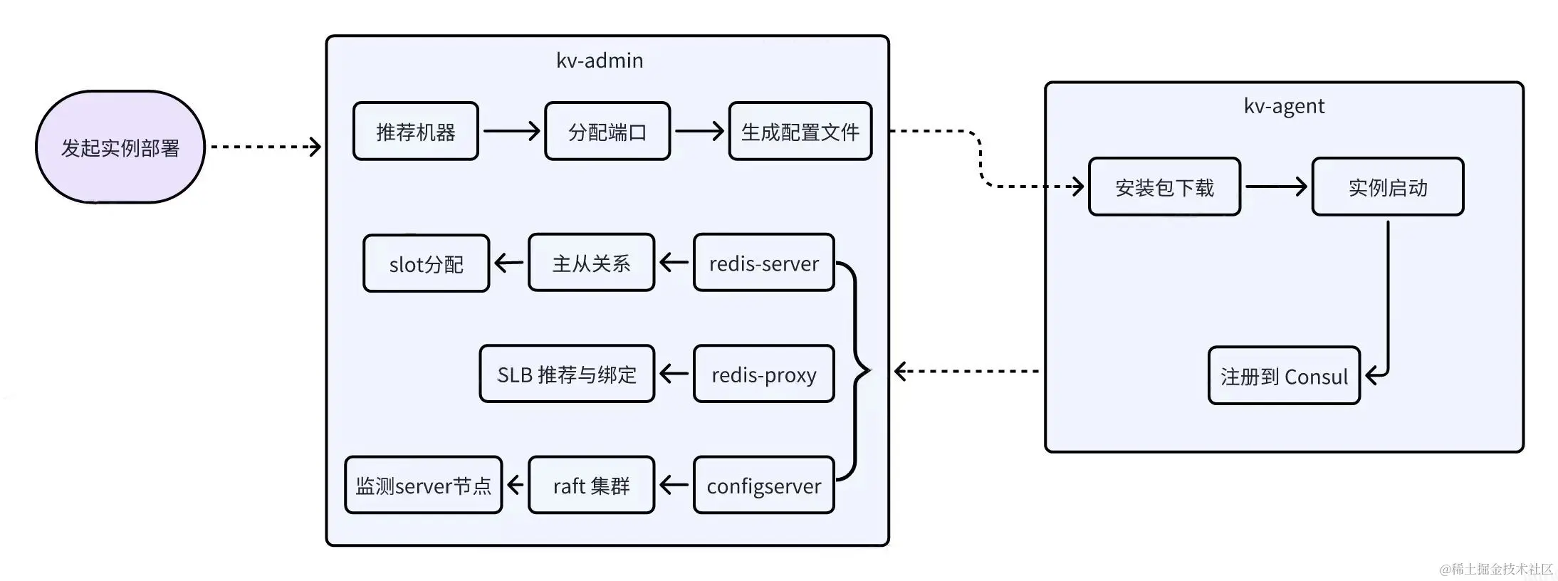 一个缓存实例的部署非常复杂,涉及机器选择、配置文件准备、节点安装与启动、槽位分配、主从关系设置、SLB 分配与绑定、以及相关组件的部署等一系列动作。
