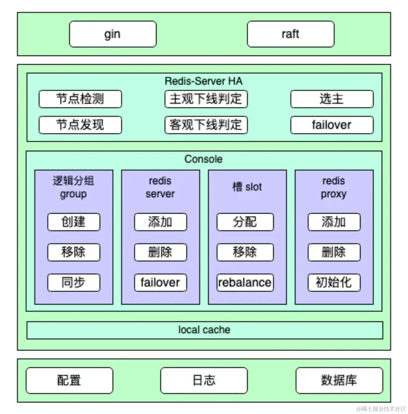 ConfigServer 是自建 Redis 系统中关键组件之一,跨多可用区多节点部署,采用 Raft 协议实现 ConfigServer 组件高可用;ConfigServer 主要负责三方面职责:
