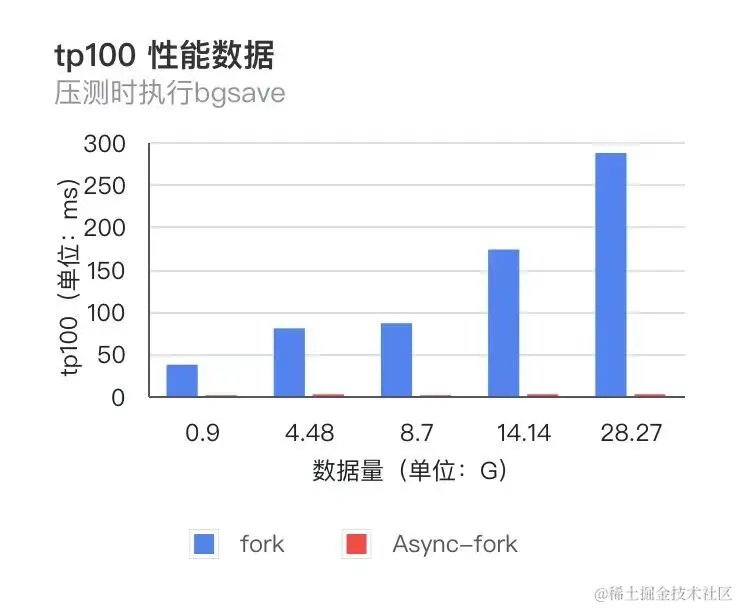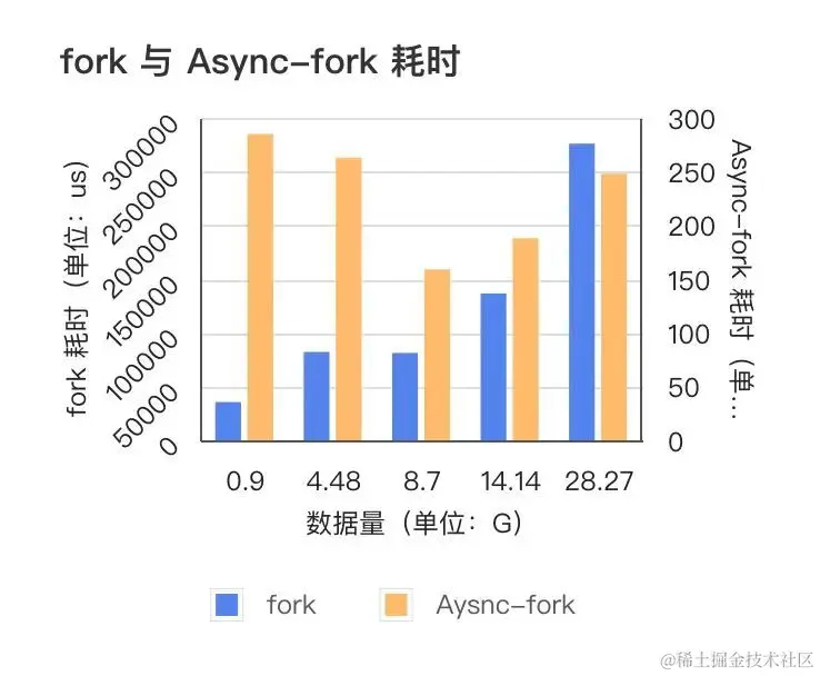 - Fork 命令耗时大幅减小,并且不随数据量增长而增长,基本稳定在 200 微秒左右;