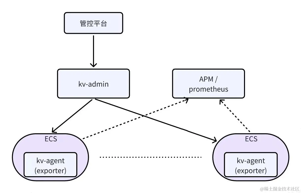 每个 ECS 上会部署一个 Kv-Agent 组件,Kv-Agent 负责完成实例部署、实例启停等操作;基于心跳元数据的 Exporter 自动注册与解除;