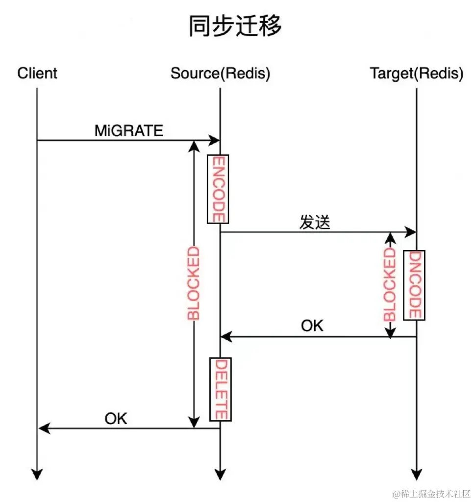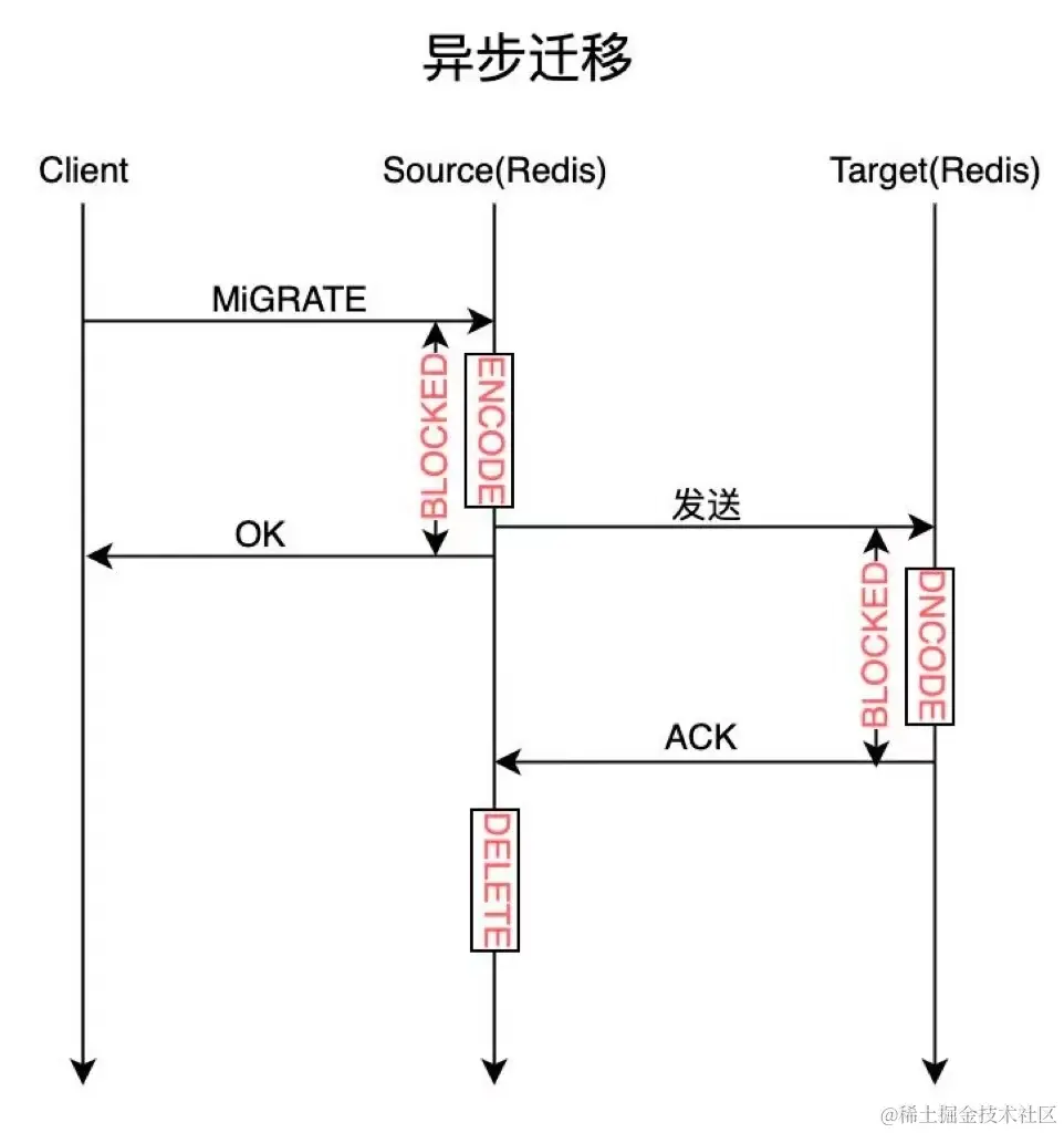 同步迁移:即在上述整个迁移过程中,源端的 Migrate 命令处于阻塞状态,直到目标端成功加载数据,并且返回成功,源节点删除该 Key 后,Migrate 命令才响应客户端成功。由于 Redis 数据操作是一个单线程模型,所有命令的处理的都在主线程中处理,因此 Migrate 命令会极大地影响其他正常业务的访问。
