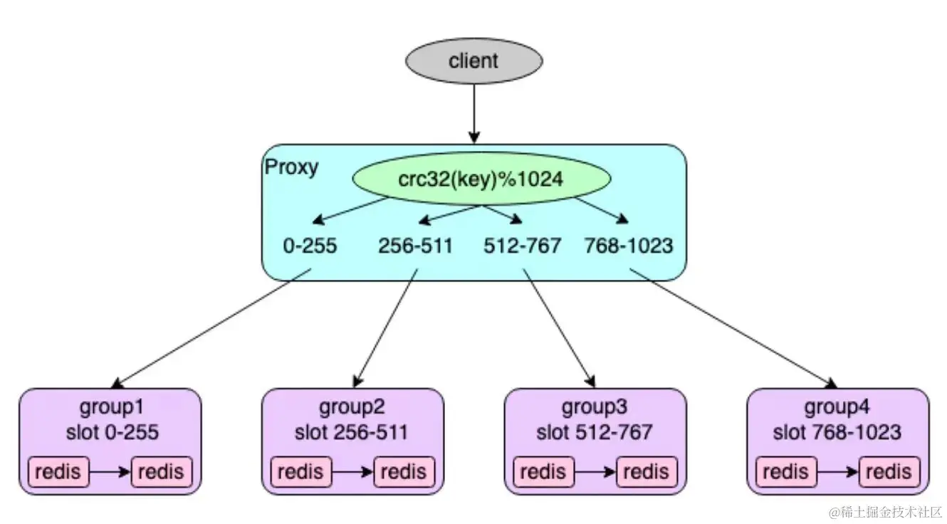 在自建 Redis 中,每个集群可能包含多个 Group,每个 Group 对应一组主从 Redis-Server 节点,每个 Group 负责一部分 Key,同时,整个集群划分为 1024 个槽(slot),每个 Group 负责其中一部分槽(slot),用户写入的 Key 通过以下算法来计算对应的 slot,然后存储到对应节点。