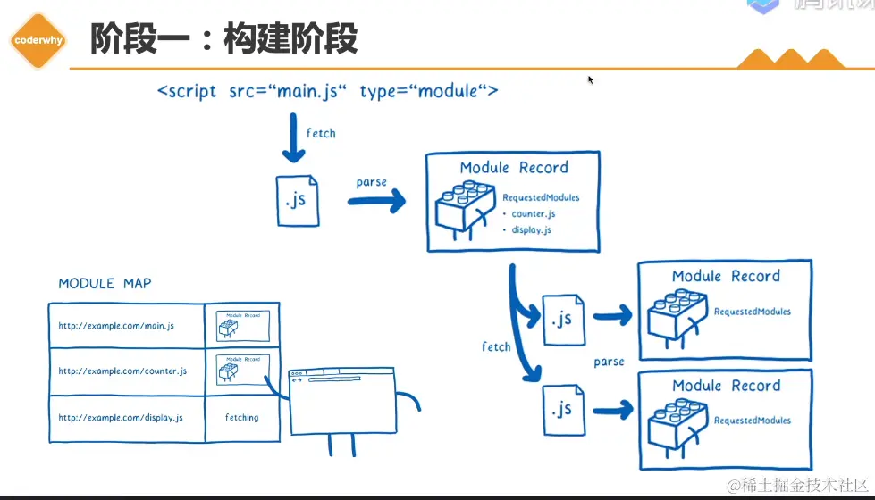 构建阶段,主要作用是下载依赖的js文件。从服务器里面把当前依赖的main.js下载下来,对js文件做一个解析,解析过程是静态分析的过程,不会运行里面的代码。解析后生成一个Module Record数据结构,这个数据结构有一个专门的属性(RequestedModules)用来记录,当前文件依赖其他那些文件。再到服务器中去请求counter.js 和display.js这两个文件,把这两个文件下载下来后,再对他们做一个解析,解析完以后又生成两个Module Record数据结构。如果多个文件依赖同一个文件,这个文件不会被重复下载,内部有一个映射MODULE MAP来记录当前那些已经在下载,那些文件已经被下载了。