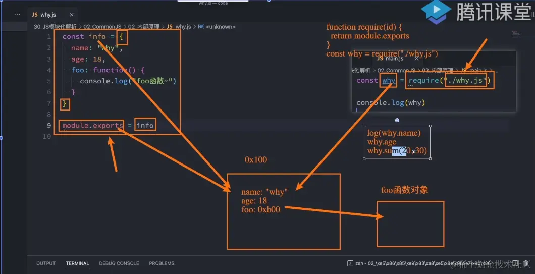 如上图中,why.js文件中module.exports将info这个对象导出,此时module.exports为一个对象,并且指向info。在外部的文件中,使用require函数引入时,require函数会有一个返回值,返回的就是module.exports导出的对象。