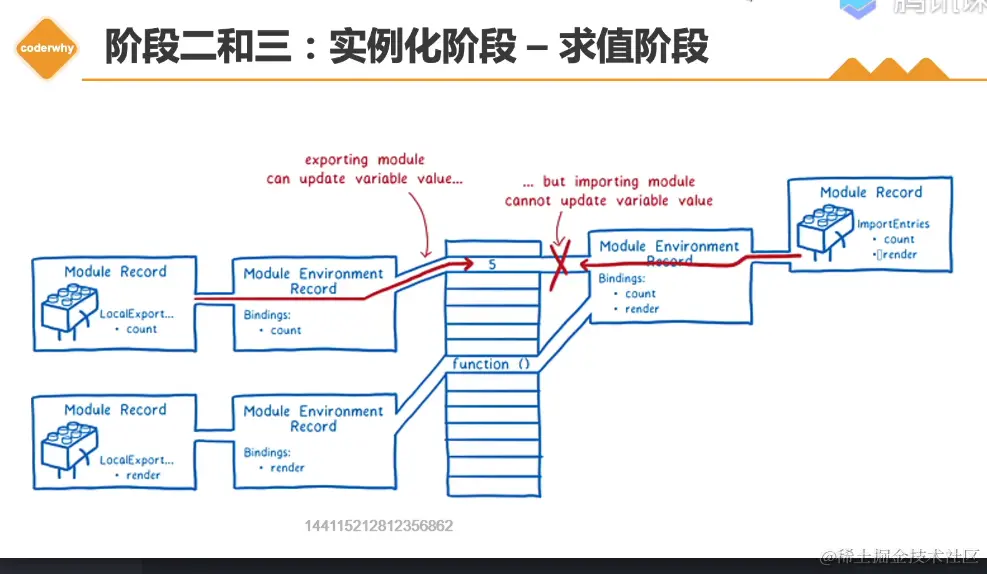 Module Record 经过实例化会生成一个Module Environment Record模块环境记录,里面有一个Bindings绑定,绑定count,在实例化分配的内存空间当中会专门记录count这个值,在记录过程中刚开始是一个undefined。另外一个模块环境记录里面绑定了render函数,刚开始导出的时候也是一个undefined。
