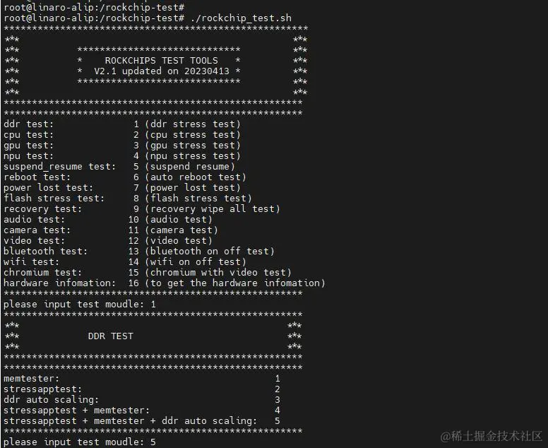 - 运行rockchip-test测试脚本:选择 1:ddr stress test 继续选择5:stressapptest + memtester + ddr auto scaling