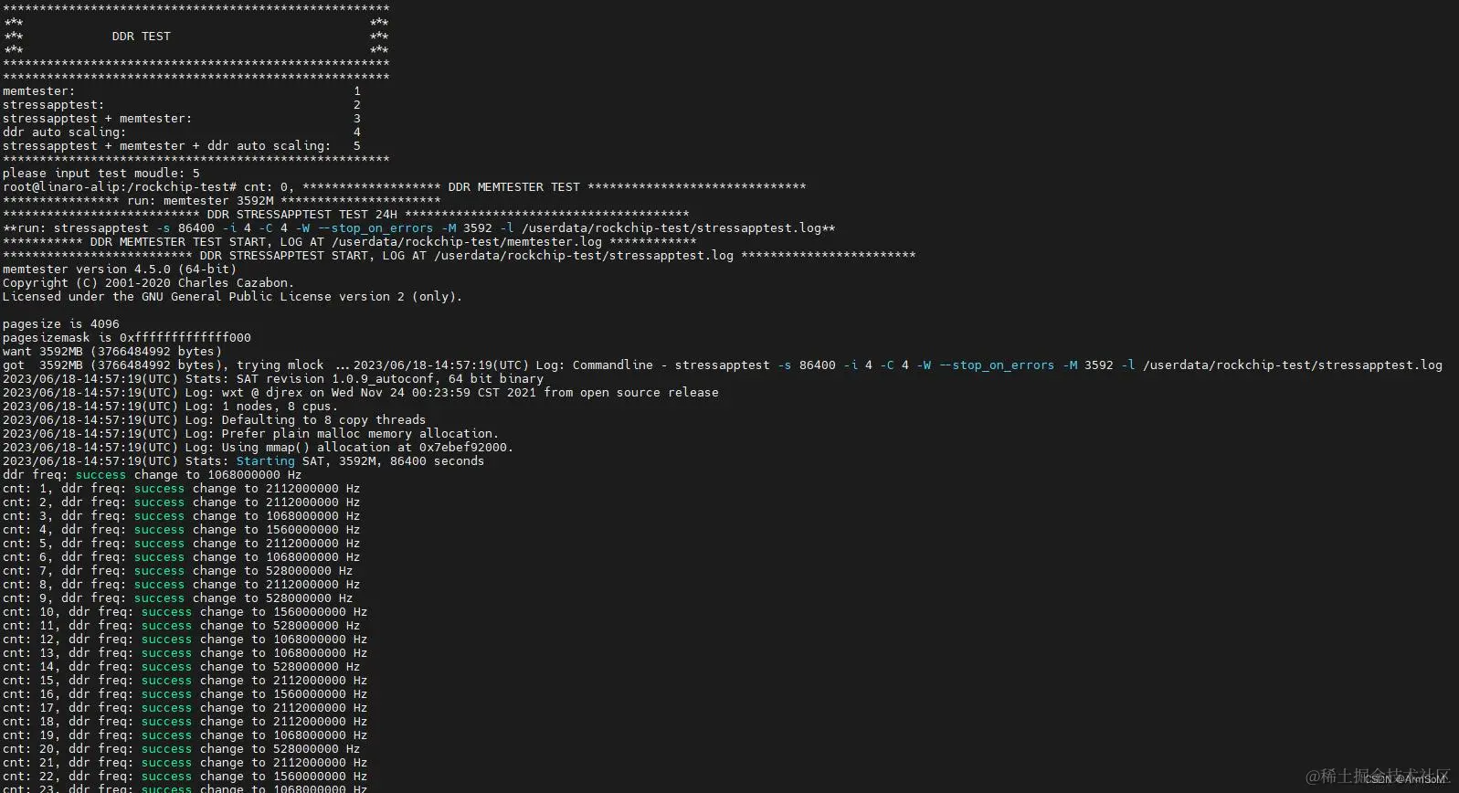 - 测试原理:运行RK官方的DDR压力测试脚本,同时对DDR进行三项压力测试,看开发板运行情况,是否能扛起24小时的连续DDR压力测试。