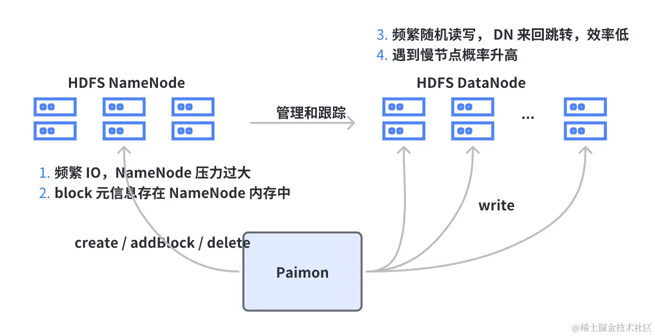 字节内部的实践是基于 HDFS 为存储底座的,我们将小文件定义为明显小于 HDFS 上一个 Block 大小的文件。小文件引出最直接的问题就是文件数量太多导致需要更多的 Block,比如 Create Block,Delete Block等,直接的影响就是 I/O 操作频繁,会导致 HDFS 上的 NamaNode 压力过大对稳定性产生影响;另外,无论文件本身有多大,它的 Block 的元信息是固定的,而这些元信息都是存在 NameNode 内存里的,过多的 Block 元信息会造成内存 OOM 问题;当数据太分散/文件数量太多时,数据就有可能被分配到更多的 HDFS 的 DataNode 里,就会造成 DataNode 的来回跳转,增加频繁的随机读写,使效率和性能变低;并且分配的 DataNode 变多遇到慢节点的概率也会变大。