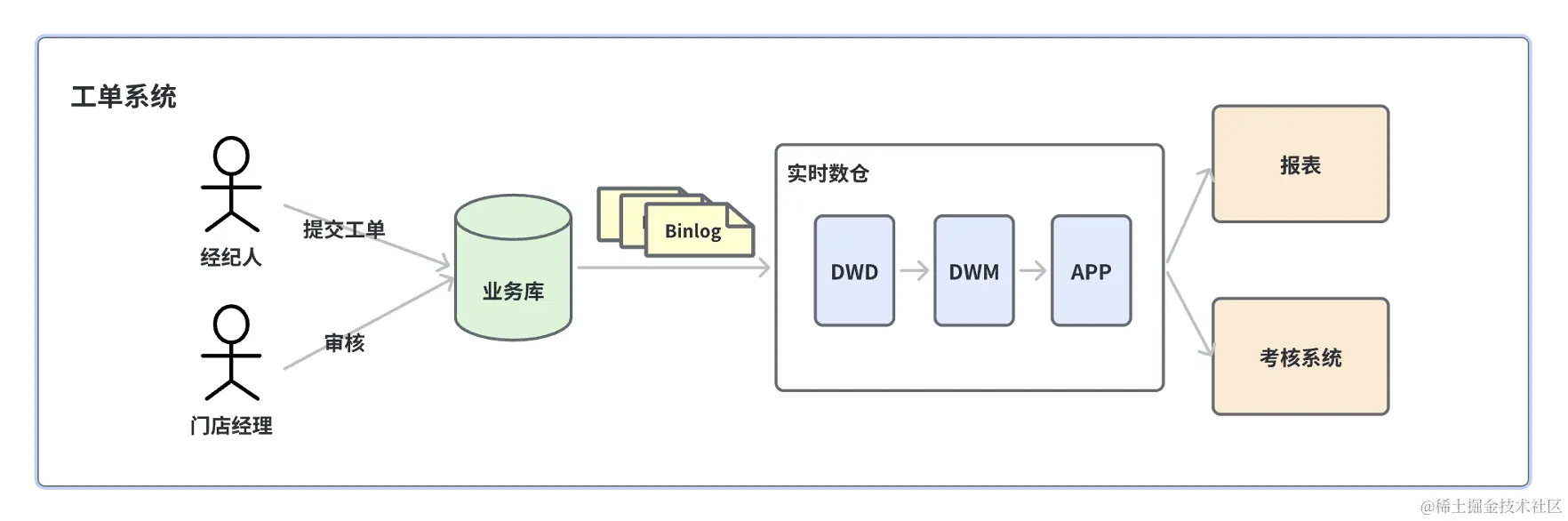幸福里业务是字节旗下关于房产的业务线,围绕这个业务有很多针对 BP 支持的方向,其中最重要的方向之一就是工单系统。工单系统面向的用户是幸福里业务线一线的经纪人和门店经理等。如下图所示,我们可以看下数据是如何通过工单系统产生和流转的。