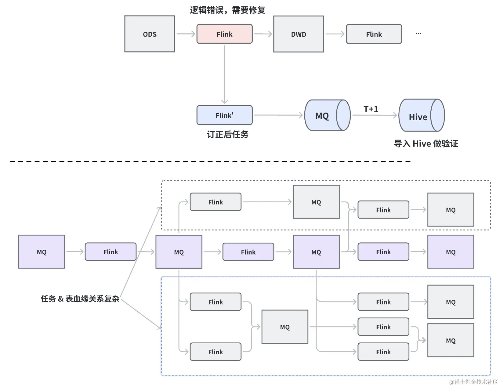 这里的数据运维包含三个部分:数据排查、数据验证和数据订正。存在的问题是,在数据排查和数据验证的过程中,如果发现某条链路上的某个 SQL 作业需要订正。订正完成的 SQL 的结果输出到 MQ 中,需要再将 MQ 中的数据落盘到存储中的操作会产生 T+1 的代价。另外在订正过程中的中间结果回退会直接暴露给用户。